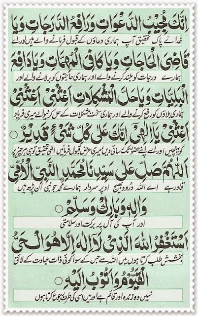 اللَّهُمَّ صَلِّ عَلَىٰ سَيِّدِنَا مُحَمَّدٍ صَلَاةً تُنْجِينَا بِهَا مِنْ جَمِيعِ الْأَهْوَالِ وَالْآفَاتِ ❁ وَتَقْضِى لَنَا بِهَا جَمِيعَ الْحَاجَاتِ ❁ وَتُطَهِّرُنَا بِهَا مِنْ جَمِيعِ السَّيِّئَاتِ❁ وَتَرْفَعُنَا بِهَا عِنْدَكَ أَعْلَى الدَّرَجَاتِ ❁ وَتُبَلِّغُنَا بِهَا أَقْصَى الْغَايَاتِ ❁ مِنْ جَمِيعِ الْخَيْرَاتِ ❁ فِي الْحَيَاةِ وَبَعْدَ الْمَمَاتِ