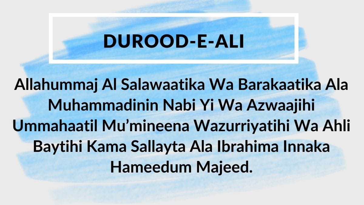 Allahumma Salli Ala Muhammadiw Wa Ala Aali Muhammadin Kamaa Sallaita Ala Ibrahima Wa Ala Aali Ibrahima Innaka Hamidum Majid. Allahumma Baarik Ala Muhammadiw Wa Ala Aali Muhammadin Kamaa Baarakta Ala Ibrahima Wa Ala Aali Ibrahima Innaka Hamidum Majid.