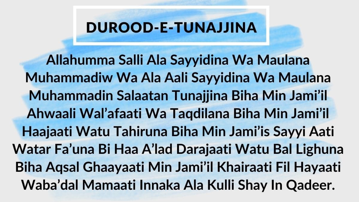 Allahumma Salli Ala Sayyidina Wa Maulana Muhammadiw Wa Ala Aali Sayyidina Wa Maulana Muhammadin Salaatan Tunajjina Biha Min Jami’il Ahwaali Wal’afaati Wa Taqdilana Biha Min Jami’il Haajaati Watu Tahiruna Biha Min Jami’is Sayyi Aati Watar Fa’una Bi Haa A’lad Darajaati Watu Bal Lighuna Biha Aqsal Ghaayaati Min Jami’il Khairaati Fil Hayaati Waba’dal Mamaati Innaka Ala Kulli Shay In Qadeer.