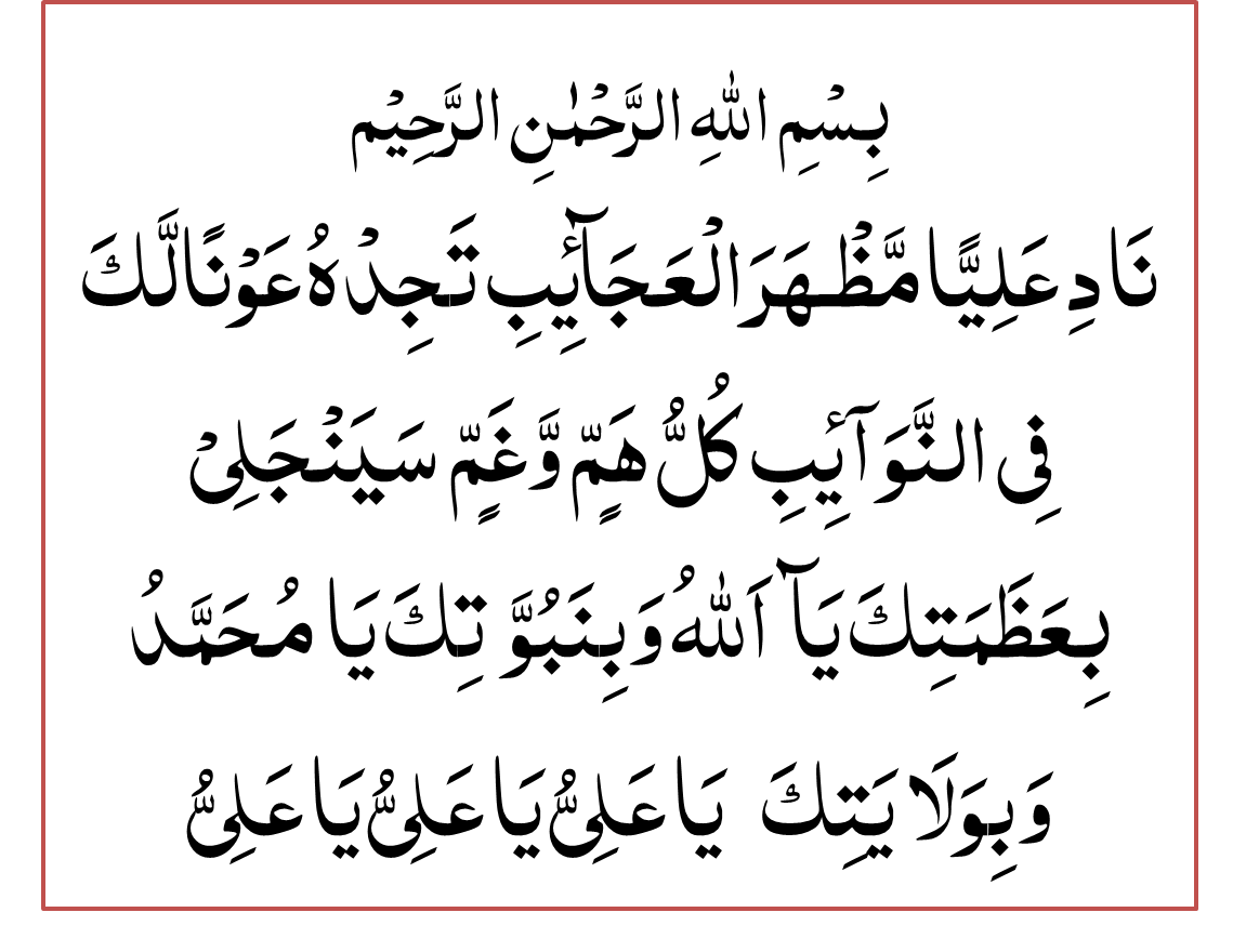 “NAAD-E-‘ALI YAM MAZHARIL ‘AJAAIBI TAJID HU ‘AWNALLAKA FINNAWAA IBI QULLU HAMINWWA ‘GHAMMIN SAYANJALI BI RAHMATIKA YA ALLAHU WABI NABUWWATIKA YA MUHAMMADU WABI WIL AYAATIKA YA ALIYYU YA ALIYYU YA ALI”