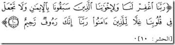 10. “Our Lord! Forgive us and our brethren who have preceded us in Faith, and put not in our hearts any hatred against those who have believed. Our Lord! You are indeed full of kindness, Most Merciful.
