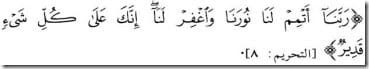 8. “Our Lord! Keep perfect our Light for us [and do not put it off till we cross over the Sirat (a slippery bridge over the Hell) safely] and grant us forgiveness. Verily, You are Able to do all things.”