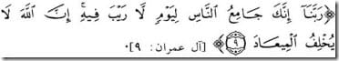 9. “Our Lord! Verily, it is You Who will gather mankind together on the Day about which there is no doubt. Verily, Allah never breaks His Promise”.