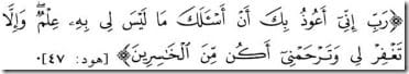 47. “O my Lord! I seek refuge with You from asking You that of which I have no knowledge. And unless You forgive me and have Mercy on me, I will indeed be one of the losers.”