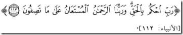 112. “My Lord! Judge You in truth! Our Lord is the Most Gracious, Whose Help is to be sought against that which you attribute (unto Allah that He has offspring, and unto Muhammad (S) that he is a sorcerer, and unto the Qur’an that it is poetry)!”