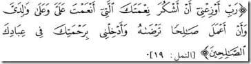 “My Lord! Grant me the power and ability that I may be grateful for Your Favours which You have bestowed on me and on my parents, and that I may do righteous good deeds that will please You, and admit me by Your Mercy among Your righteous slaves.”