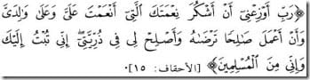 15.”My Lord! Grant me the power and ability that I may be grateful for Your Favour which You have bestowed upon me and upon my parents, and that I may do righteous good deeds, such as please You, and make my offspring good. Truly, I have turned to You in repentance, and truly, I am one of the Muslims (submitting to Your Will).”