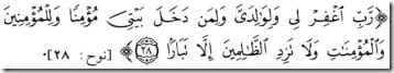 28. “My Lord! Forgive me, and my parents, and him who enters my home as a believer, and all the believing men and women. And to the Zalimun (polytheists, wrong-doers, etc.) grant You no increase but destruction!”