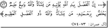 73. “All the bounty is in the Hand of Allah; He grants to whom He wills. And Allah is All-Sufficient for His creatures’ needs, All-Knower.”