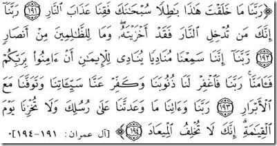 191. Those who remember Allah (always, and in prayers) standing, sitting, and lying down on their sides, and think deeply about the creation of the heavens and the earth, (saying): “Our Lord! You have not created (all) this without purpose, glory to You! (Exalted are You above all that they associate with You as partners). Give us salvation from the torment of the Fire.