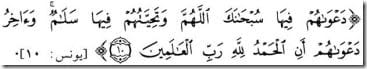 10. Their way of request therein will be Subhanaka Allahumma (Glory to You, O Allah!) and Salam (peace, safety from evil) will be their greetings therein (Paradise)! and the close of their request will be: Al-Hamdu Lillahi Rabb-il-‘Alamin [All the praises and thanks be to Allah, the Lord of ‘Alamin (mankind, jinn and all that exists)].