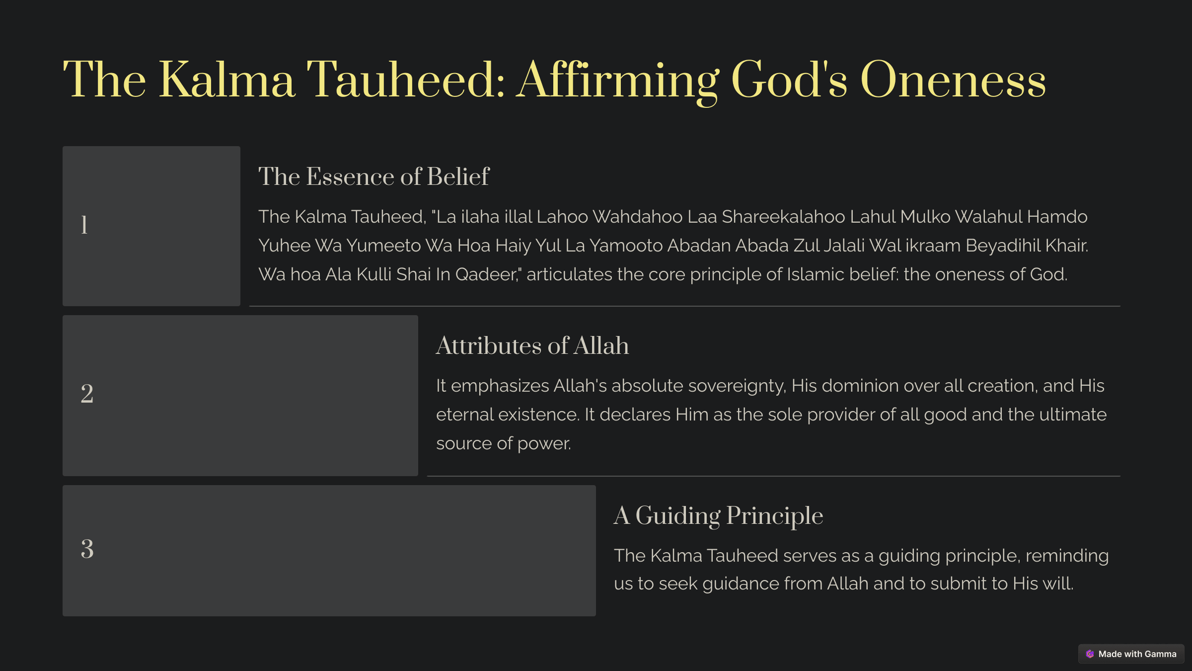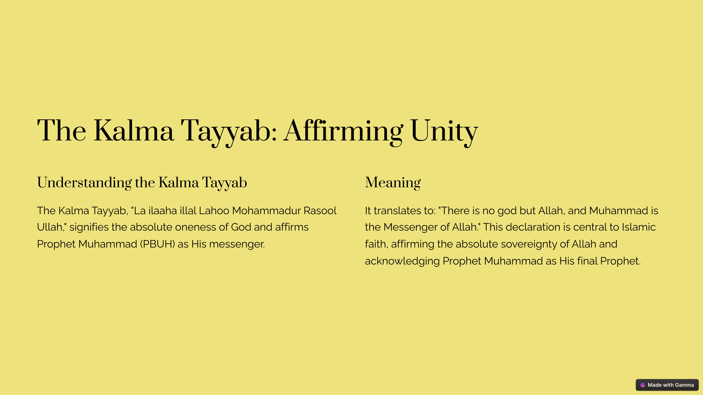 1) Kalma Tayyab: Laa ilaaha illal Lahoo Mohammadur Rasool Ullah