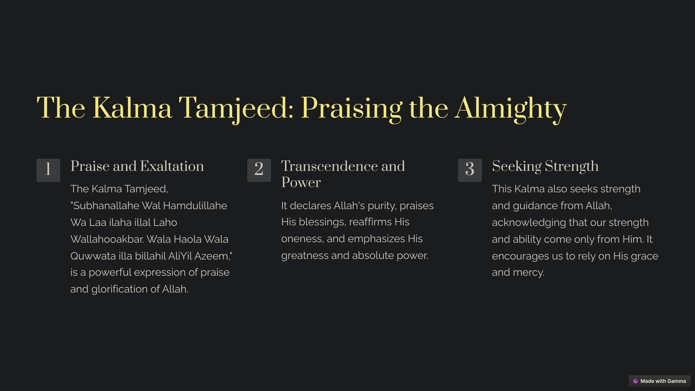 3) Kalma Tamjeed: Subhanallahe Wal Hamdulillahe Wa Laa ilaha illal Laho Wallahooakbar. Wala Haola Wala Quwwata illa billahil AliYil Azeem.