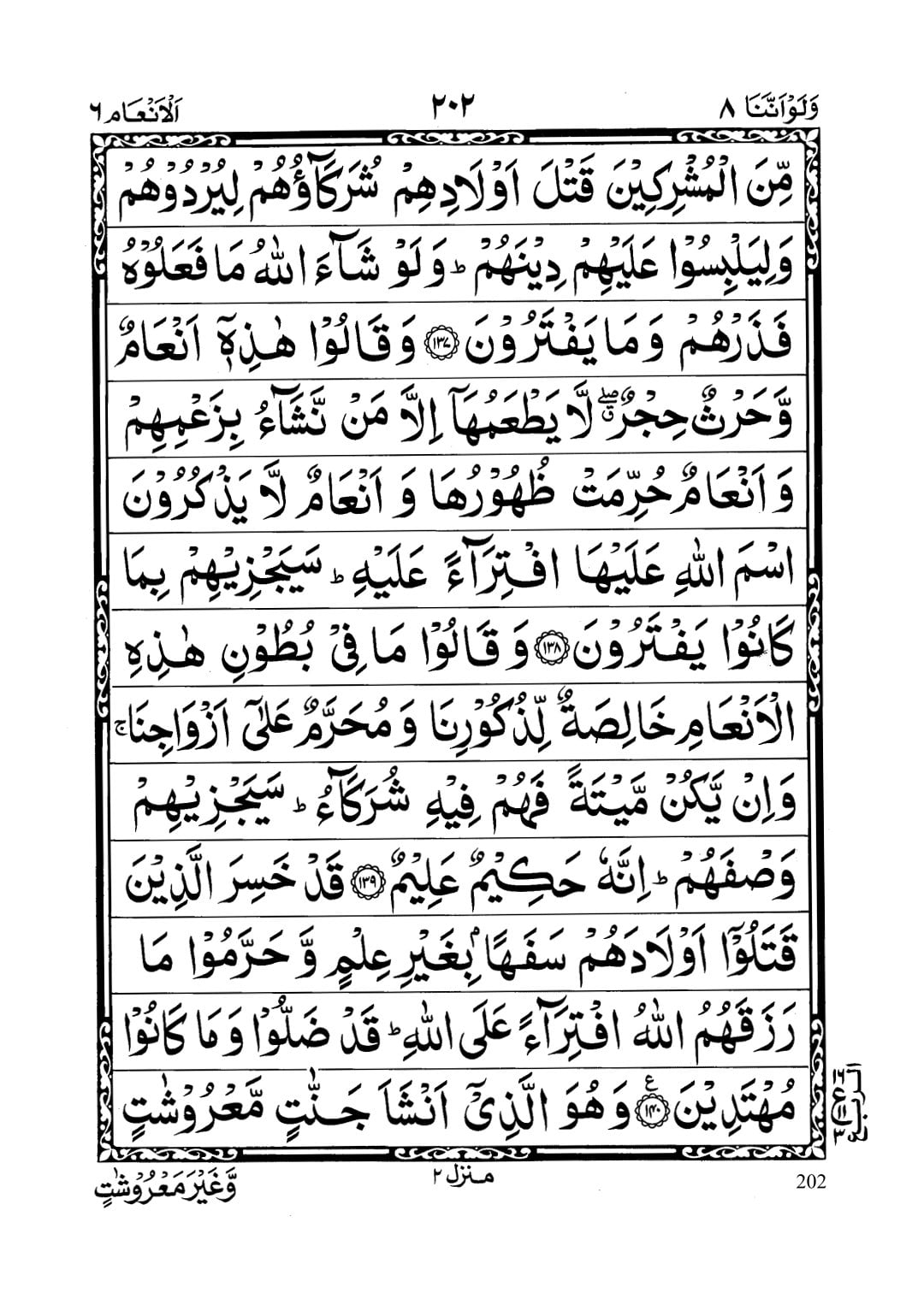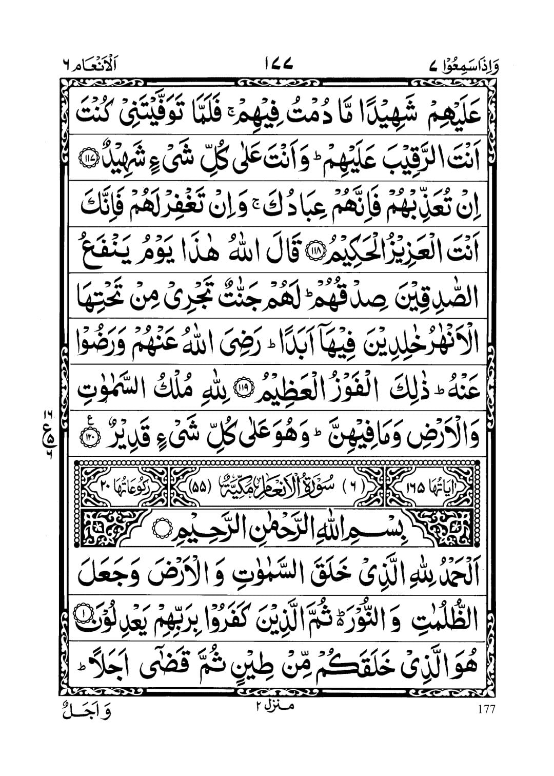 - Wa minal ibilis naini wa minal baqaris nain; qul ‘aaazzakaraini harrama amil unsayaini ammash tamalat ‘alaihi arhaamul unsayaini am kuntum shuhadaaa’a iz wassaakumul laahu bihaazaa; faman azlamu mimmanif taraa ‘alal laahi kazibal liyuddillan naasa bighairi ‘ilm; innal laaha laa yahdil qawmaz zaalimeen (section 17)