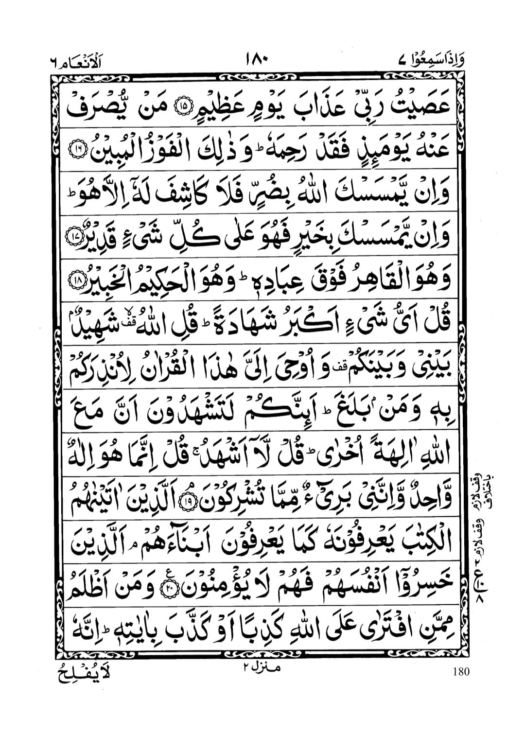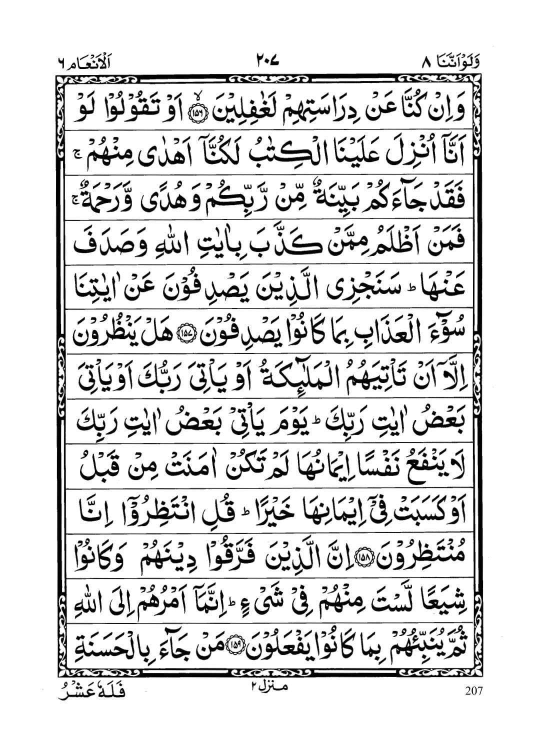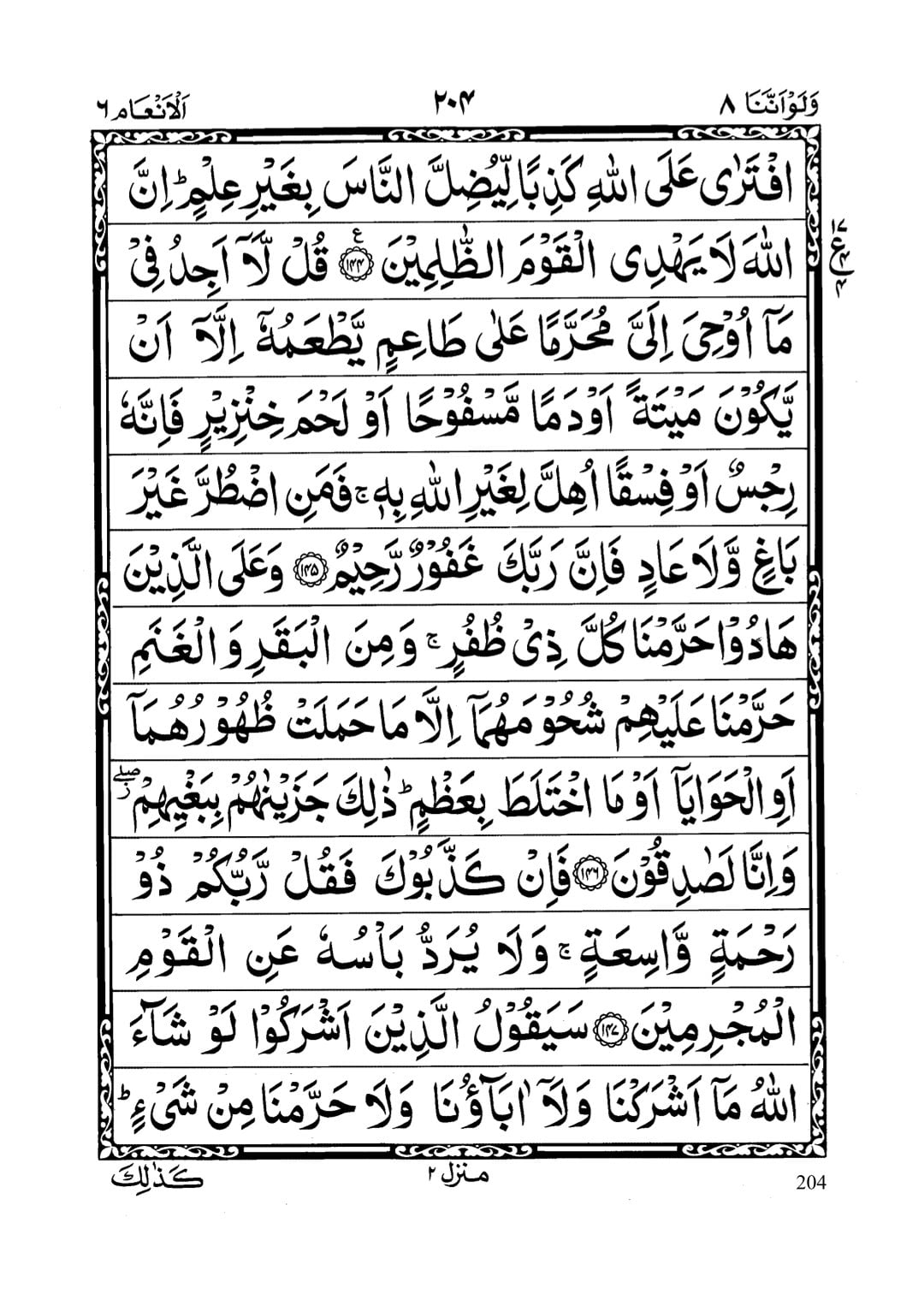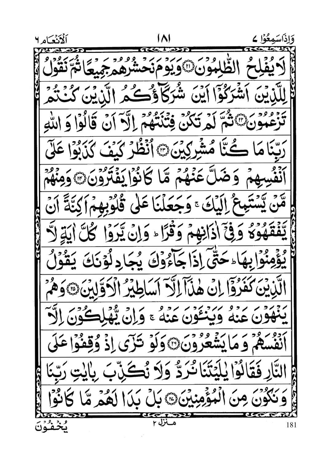 - Qul halumma shuhadaaa’akumul lazeena yash hadoona annal laaha harrama haazaa fa in shahidoo falaa tashhad ma’ahum; wa laa tattabi’ ahwaaa’al lazeena kazzaboo bi Aayaatinaa wallazeena laa yu’minoona bil Aakhirati wa hum bi Rabbihim ya’diloon (section 18)