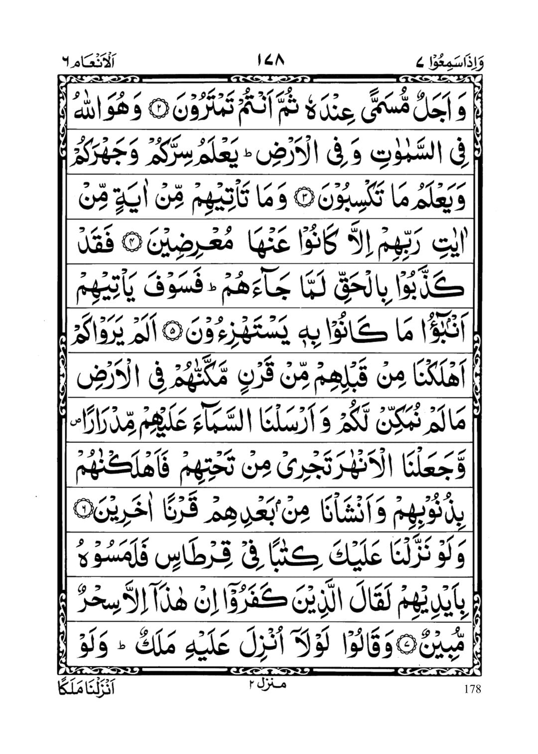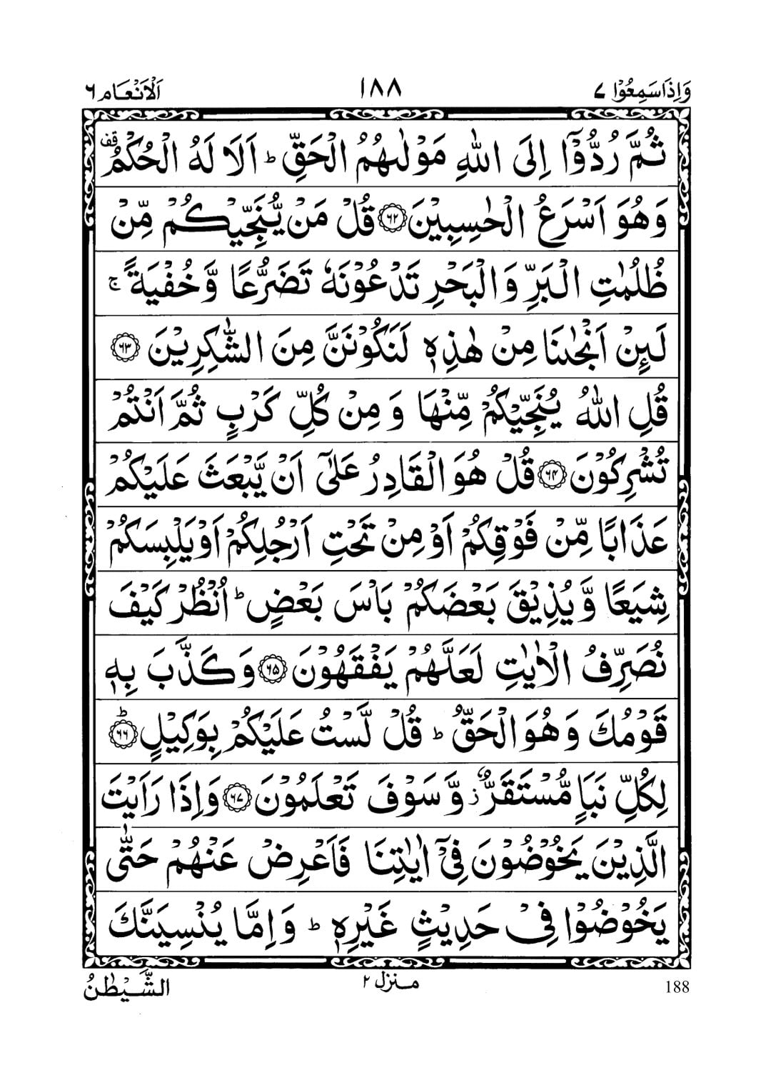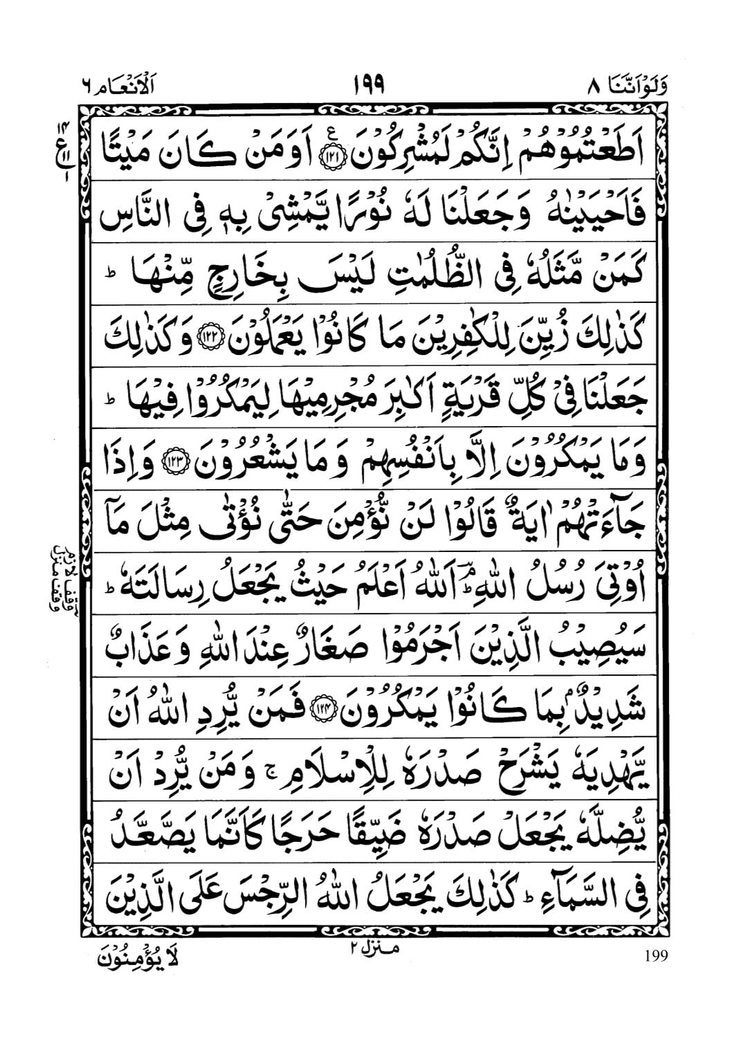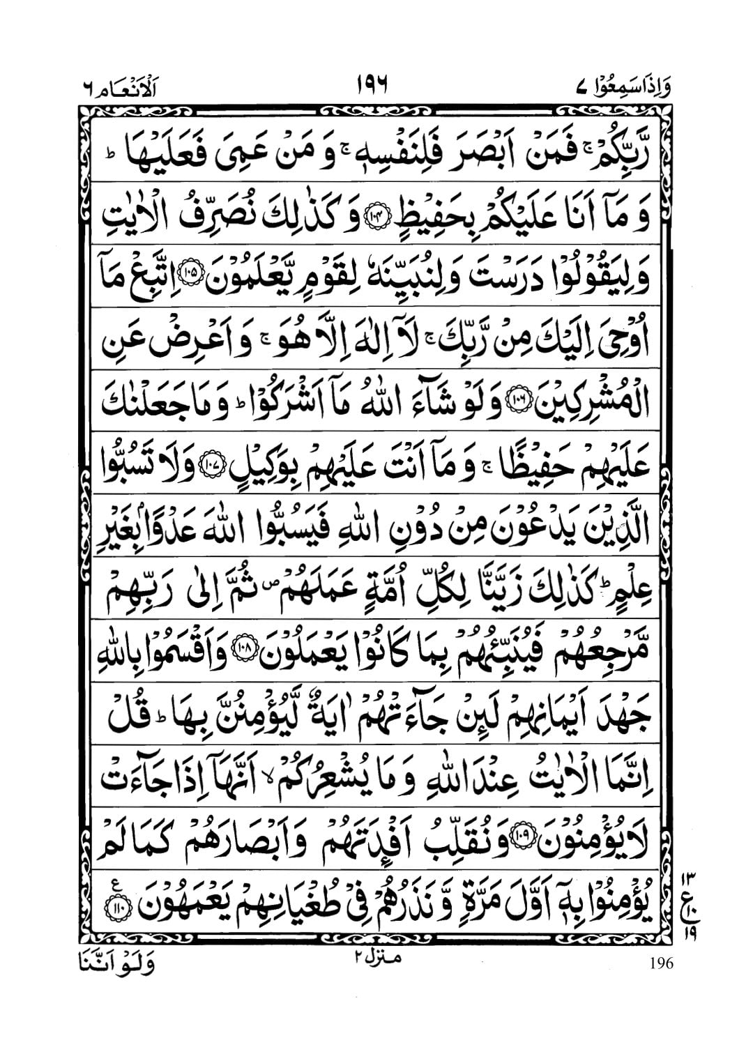 - Qul halumma shuhadaaa’akumul lazeena yash hadoona annal laaha harrama haazaa fa in shahidoo falaa tashhad ma’ahum; wa laa tattabi’ ahwaaa’al lazeena kazzaboo bi Aayaatinaa wallazeena laa yu’minoona bil Aakhirati wa hum bi Rabbihim ya’diloon (section 18)