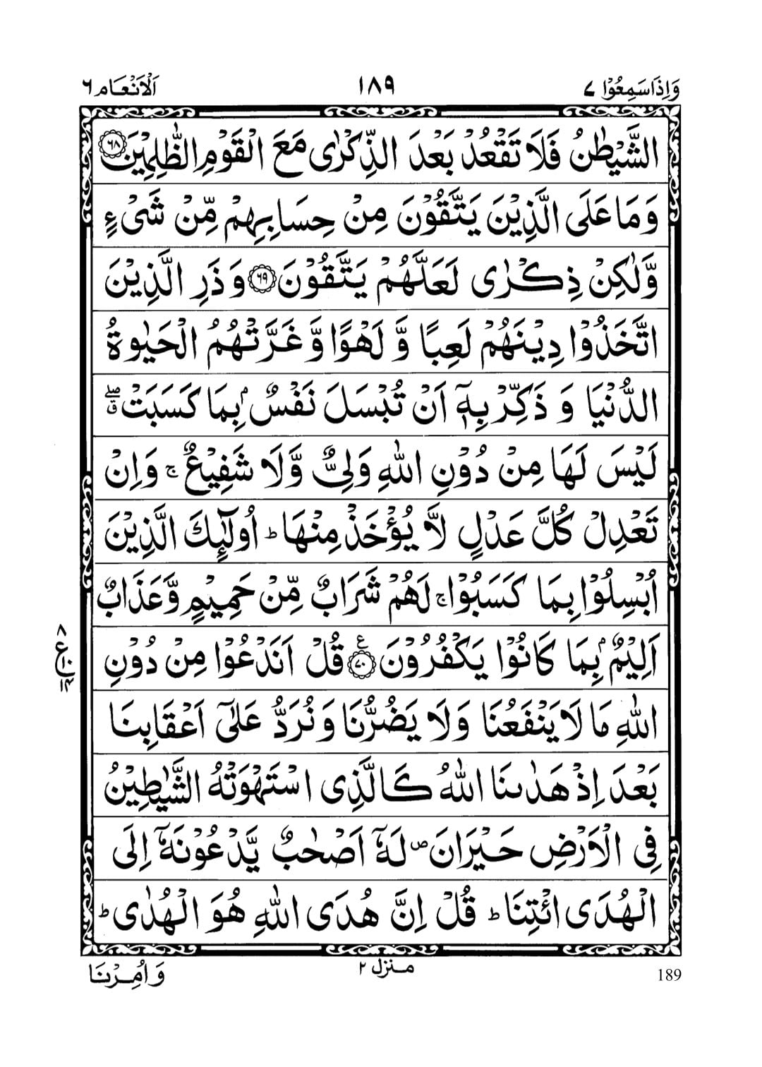 - Wa zaril lazeenat takhazoo deenahum la’ibanwwa lahwanw wa gharrat humul ha yaatud dunyaa; wa zakkir biheee an tubsala nafsum bimaa kasabat laisa lahaa min doonil laahi waliyyunw wa laa shafee’unw wa in ta’dil kulla ‘adlil laa yu’khaz minhaa; ulaaa ‘ikal lazeena ubsiloo bimaa kasaboo lahum sharaabum min hameeminw wa ‘azaabun aleemum bimaa kaanoo yakkfuroon (section 8)