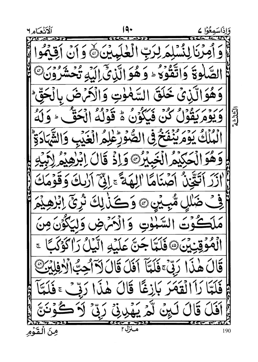 - Wa Huwal lazee khalaqas samaawaati wal arda bilhaqq; wa Yawma yaqoolu kun fa yakoon; Qawluhul haqq; wa lahul mulku Yawma yunfakhu fis Soor; ‘Aalimul Ghaibi wash shahaadah; wa Huwal Hakeemul Khabeer