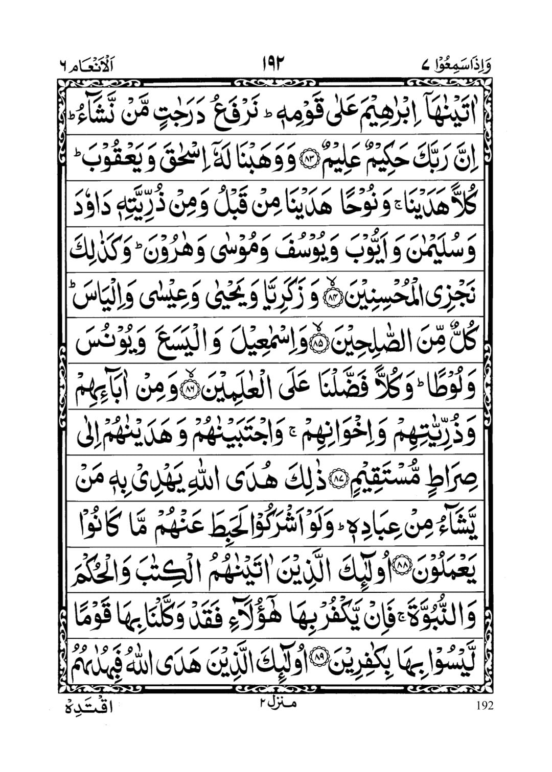 - Wa wahabnaa lahoo ishaaqa wa ya’qoob; kullan hadainaa; wa Noohan hadainaa min qablu wa min zurriyyatihee Daawooda wa Sulaimaana wa Ayyooba wa Yoosufa wa Moosaa wa Haaroon; wa kazaalika najzil muhsineen