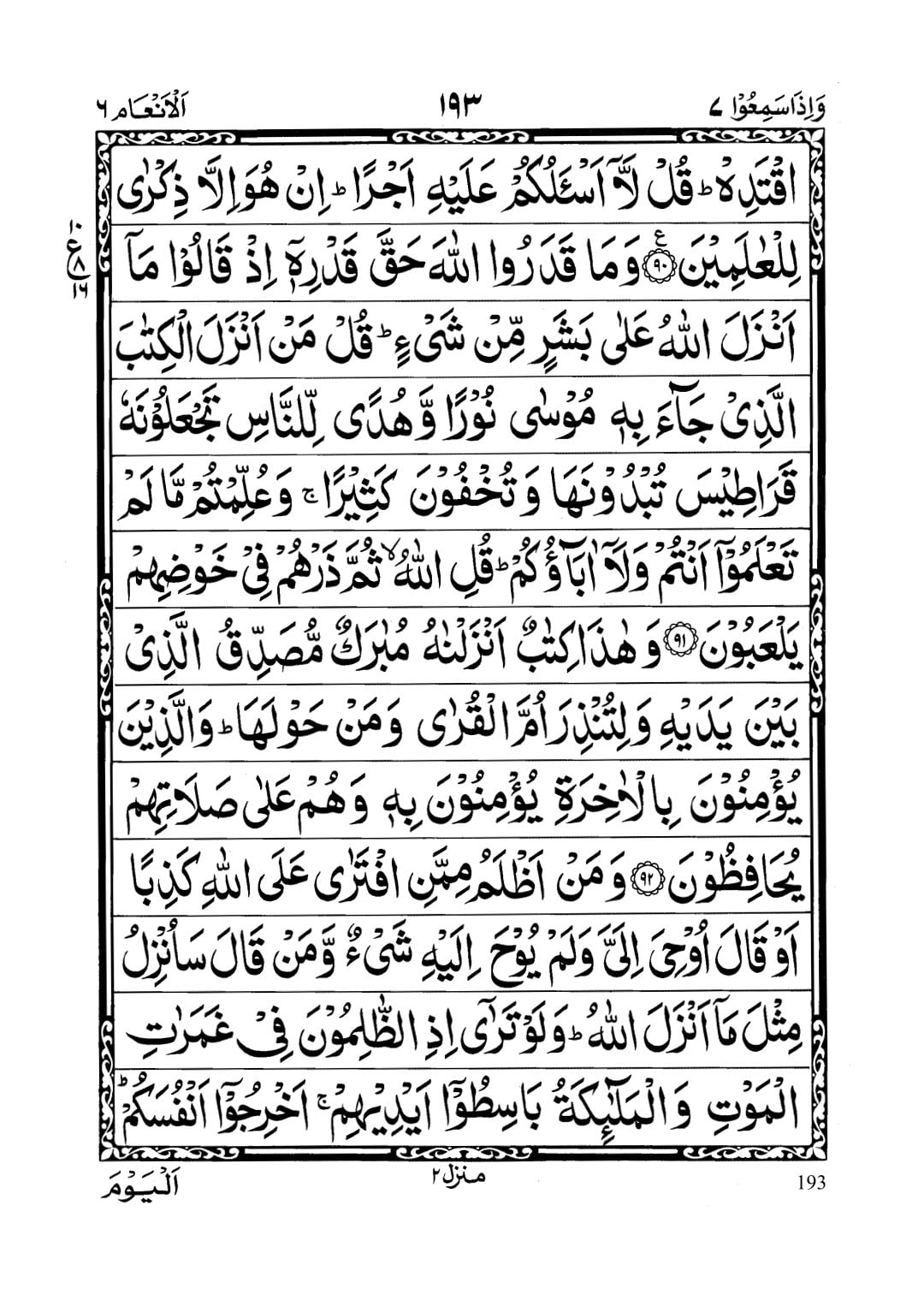 - Wa maa qadarul laaha haqqa qadriheee iz qaaloo maaa anzalal laahu ‘alaa basharim min shai’; qul man anzalal Kitaabal lazee jaaa’a bihee Moosaa nooranw wa hudal linnaasi taj’aloonahoo qaraateesa tubdoonahaa wa tukhfoona kaseeranw wa ‘ullimtum maa lam ta’lamooo antum wa laaa aabaaa’ukum qulil laahu summa zarhum fee khawdihim yal’aboon