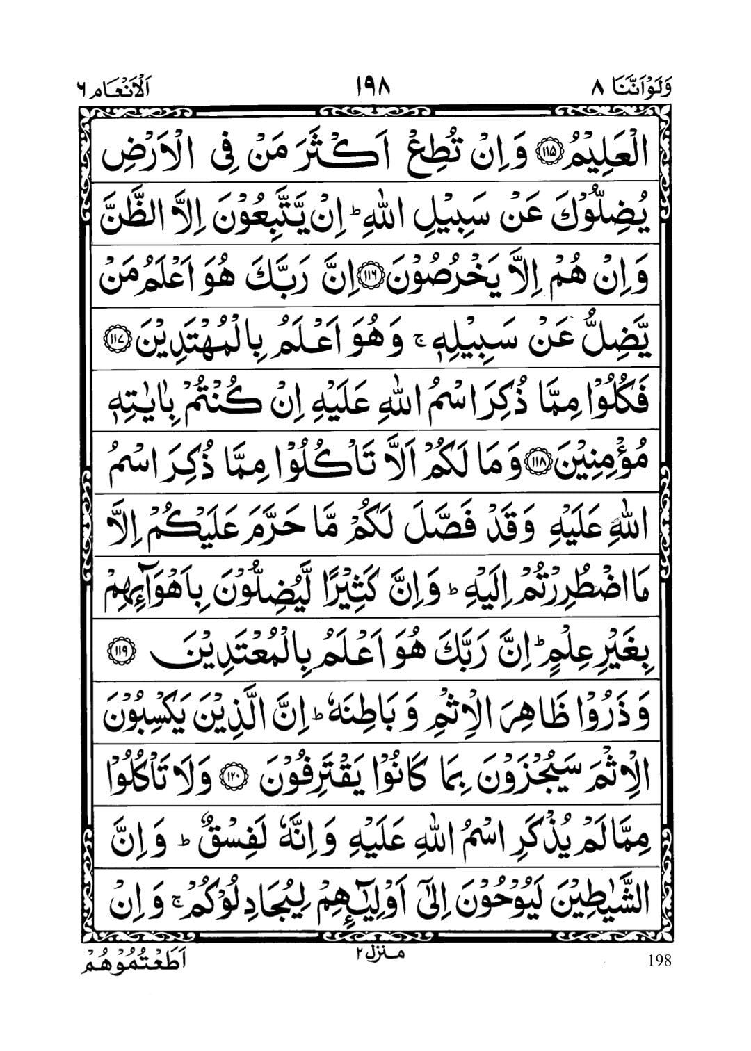 - Wa maa lakum allaa ta’kuloo mimmaa zukirasmul laahi ‘alaihi wa qad fassala lakum maa harrama ‘alaikum illaa mad turirtum ilaih; wa inna kaseeral la yudilloona bi ahwaaa’ihim bighairi ‘ilm; inna Rabbaka Huwa a’lamu bilmu’tadeen