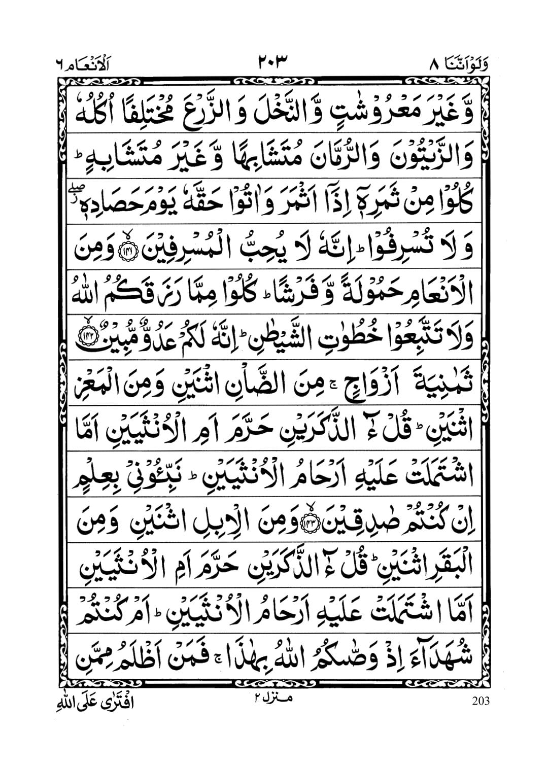 - Wa Huwal lazee ansha-a jannaatim ma’rooshaatinw wa ghaira ma’rooshaatinw wan nakhla wazzar’a mukhtalifan ukuluhoo wazzaitoona warrum maana mutashaabihanw wa ghaira mutashaabih; kuloo min samariheee izaaa asmara wa aatoo haqqahoo yawma hasaadihee wa laa tusrifoo; innahoo laa yuhibbul musrifeen