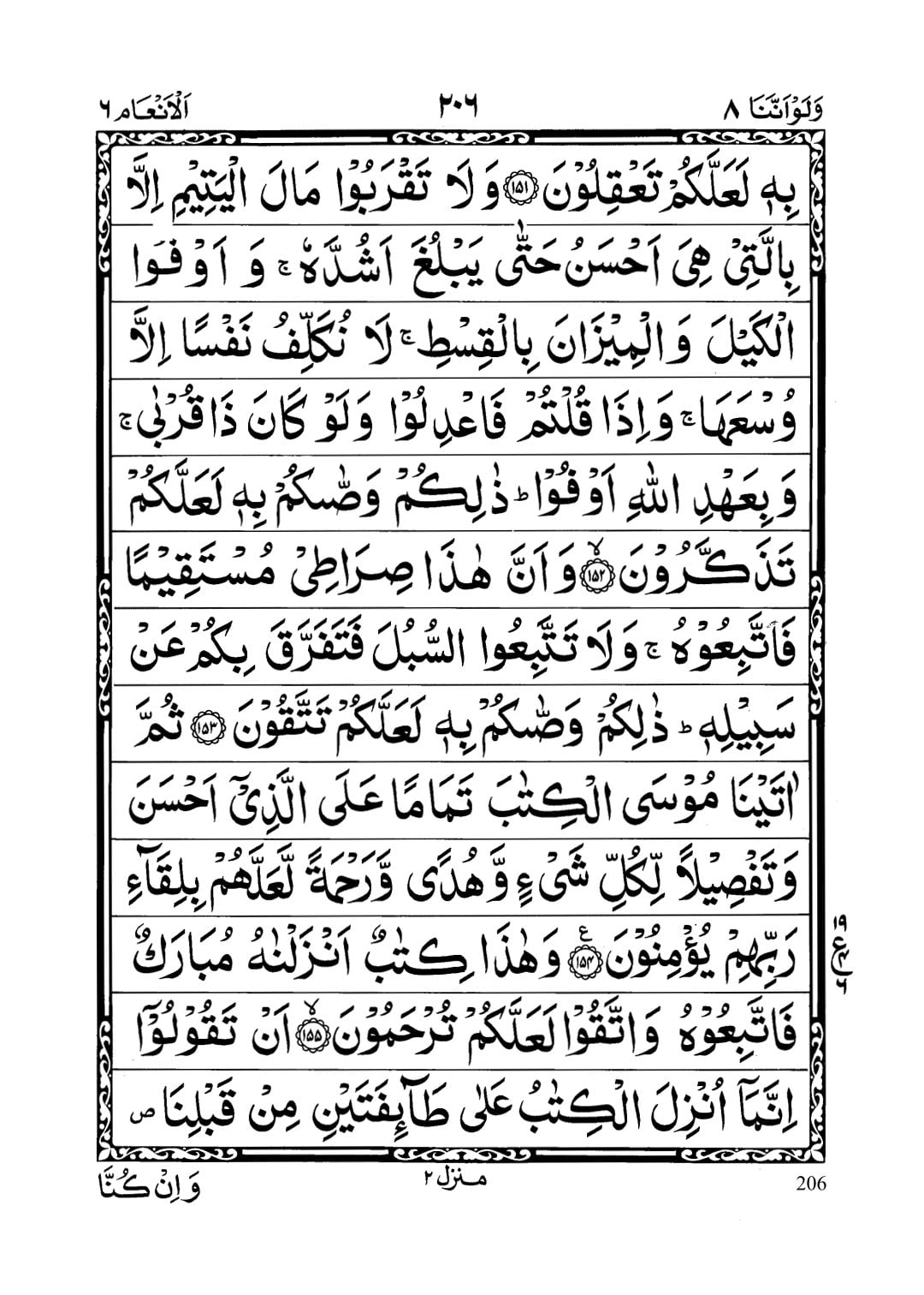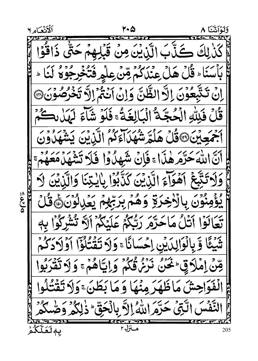 - Qul ta’aalaw atlu maa harrama Rabbukum ‘alaikum allaa tushrikoo bihee shai’anw wa bilwaalidaini ihsaananw wa laa taqtulooo awlaadakum min imlaaq; nahnu narzuqukum wa iyyaahum wa laa taqrabul fawaahisha maa zahara minhaa wa maa batana wa laa taqtulun nafsal latee harramal laahu illaa bilhaqq; zaalikum wassaakum bihee la’allakum ta’qiloon