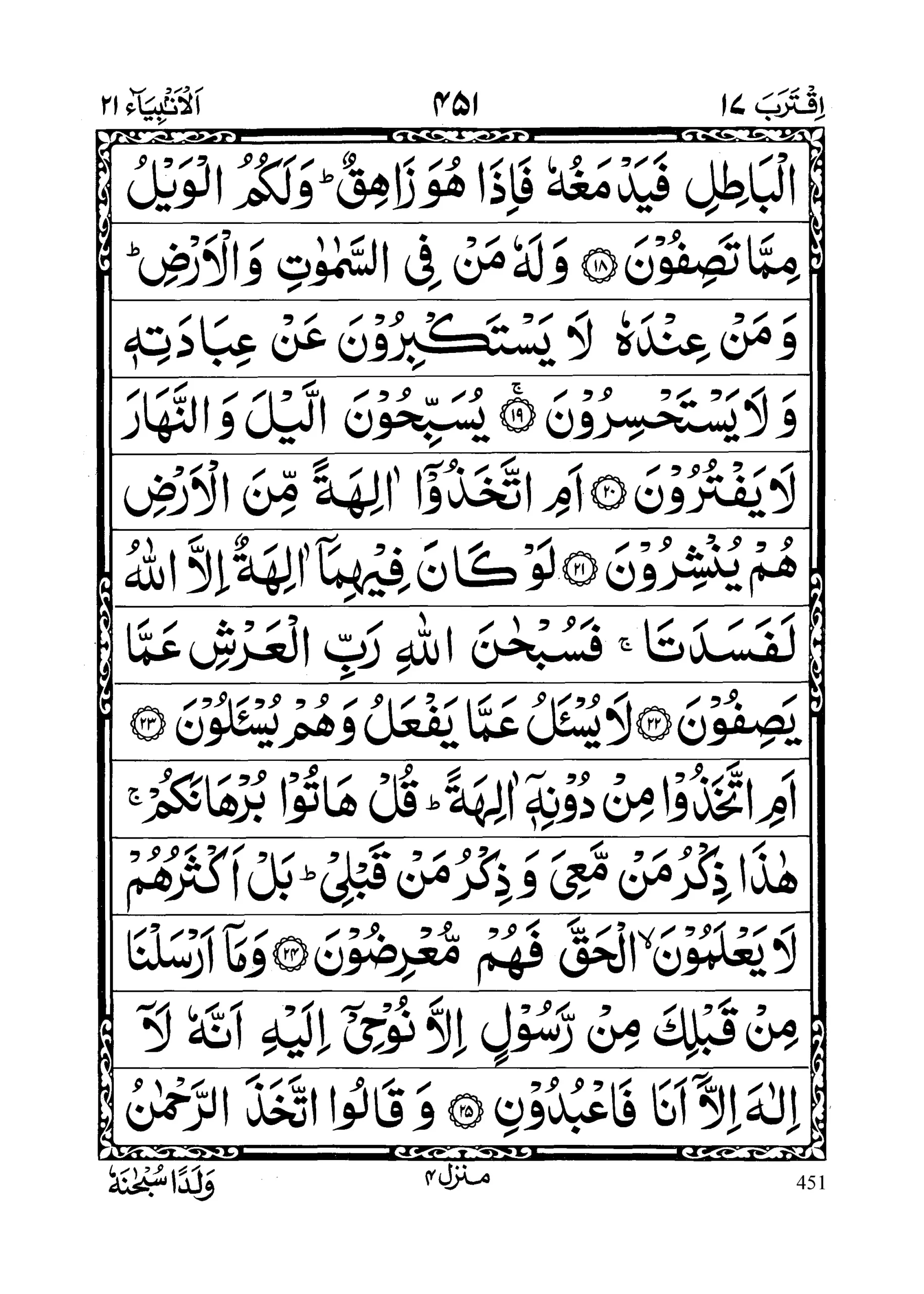 - Bal naqzifu bilhaqqi ‘alal baatili fa yadmaghuhoo fa izaa huwa zaahiq; wa lakumul wailu mimmaa tasifoon