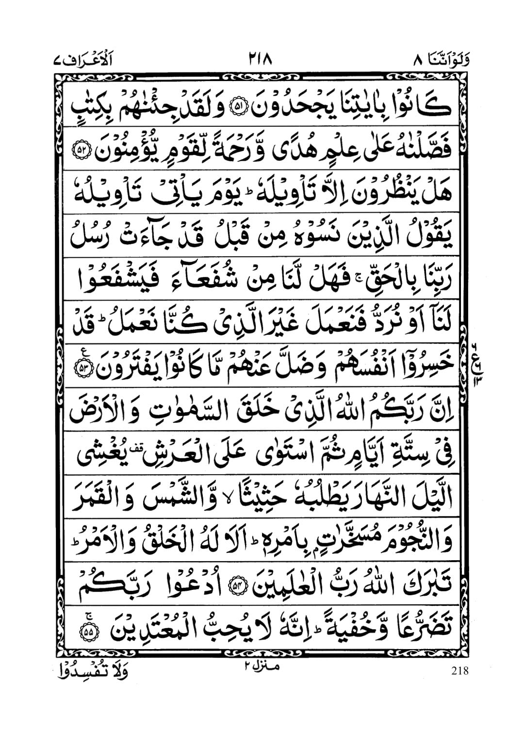 - Inna Rabbakumul laahul lazee khalaqas samaawaati wal arda fee sittati ayyaamin summas tawaa ‘alal ‘arshi yughshil lailan nahaara yatlu buhoo haseesanw washshamsa walqamara wannujooma musakharaatim bi amrih; alaa lahul khalqu wal-amr; tabaarakal laahu Rabbul ‘aalameen