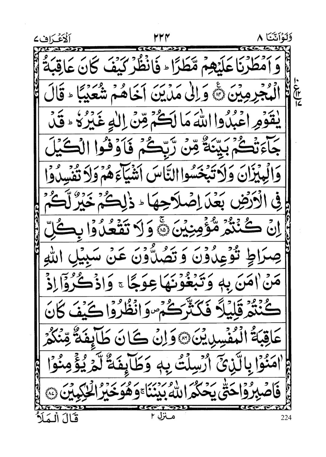 - Wa ilaa Madyana akhaahum Shu’aybaa; qaala yaa qawmi’ budul laaha maa lakum min ilaahin ghairuhoo qad jaaa’atkum baiyinatum mir Rabbikum fa awful kaila walmeezaana wa laa tabkhasun naasa ashyaa’ahum wa laa tufsidoo fil ardi ba’da islaahihaa; zaalikum khairul lakum in kuntum mu’mineen