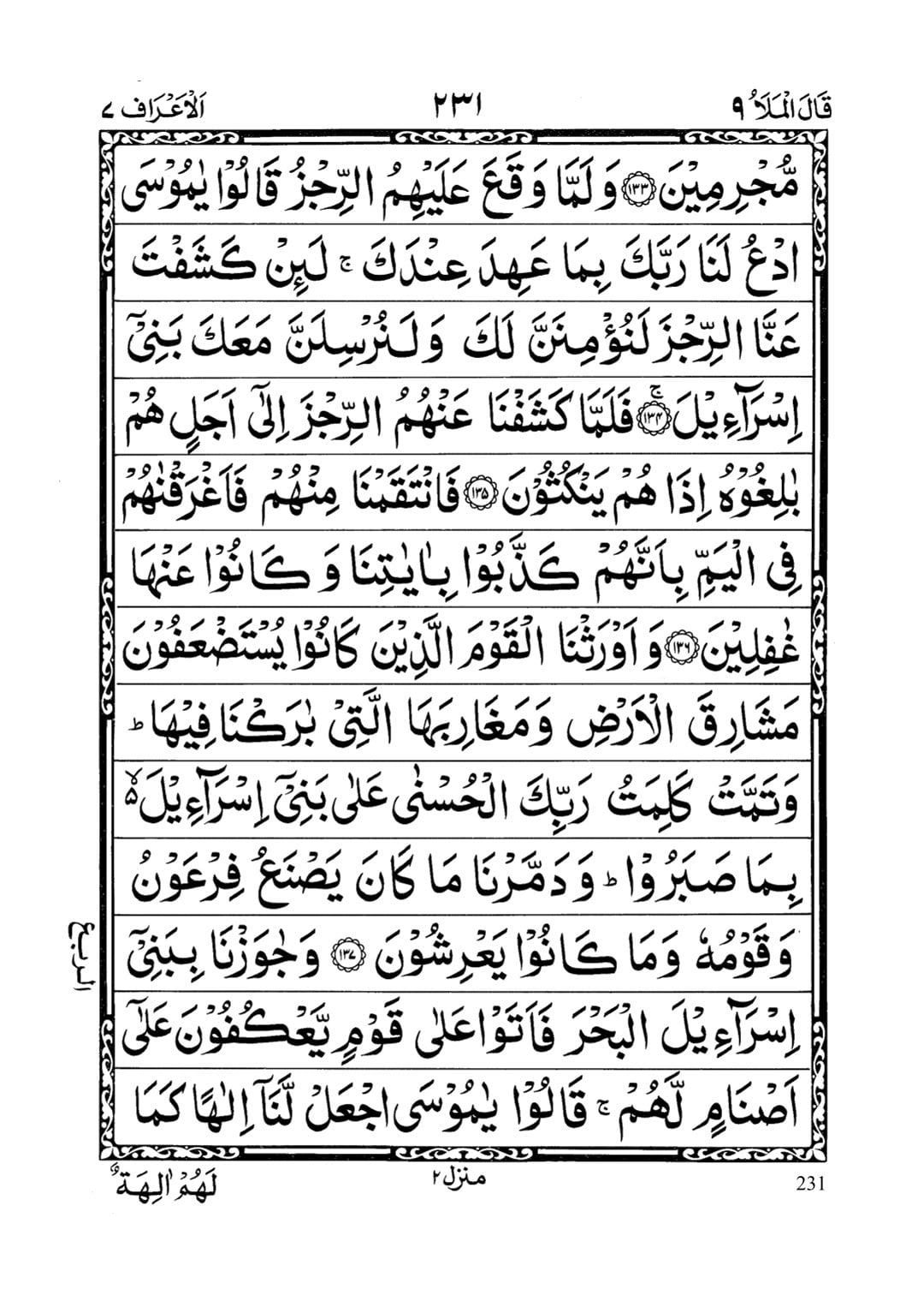- Wa awrasnal qawmal lazeena kaanoo yustad’afoona mashaariqal ardi wa maghaari bahal latee baaraknaa feehaa wa tammat kalimatu Rabbikal husnaa ‘alaa Baneee Israaa’eela bimaa sabaroo wa dammarnaa maa kaana yasna’u Fir’awnu wa qawmuhoo wa maa kaanoo ya’rishoon