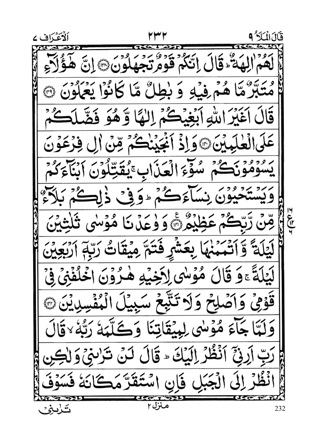 - Wa waa’adnaa Moosaa salaaseena lailatanw wa at mamnaahaa bi’ashrim fatamma meeqaatu Rabbihee arba’eena lailah; wa qaala Moosaa liakheehi Haaroonakh lufnee fee qawmee wa aslih wa laa tattabi’ sabeelal mufsideen