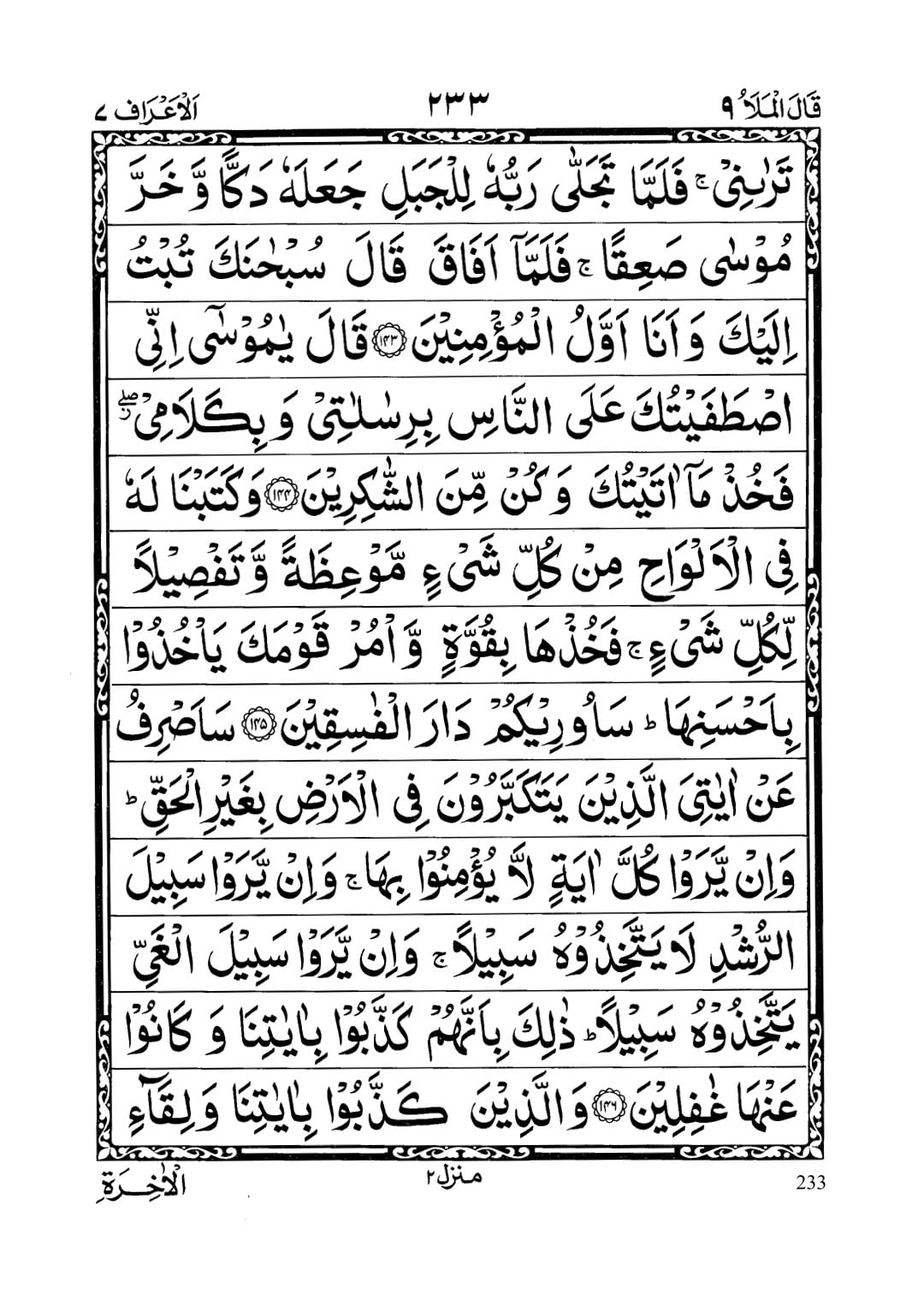 - Wa lammaa jaaa’a Moosa limeeqaatinaa wa kallamahoo Rabbuhoo qaala Rabbi arineee anzur ilaik; qaala lan taraanee wa laakininzur ilal jabali fa inistaqarra makaanahoo fasawfa taraanee; falammaa tajallaa Rabbuhoo liljabali ja’alahoo dakkanw wa kharra Moosaa sa’iqaa; falammaaa afaaqa qaala Subhaanaka tubtu ilaika wa ana awwalul mu’mineen
