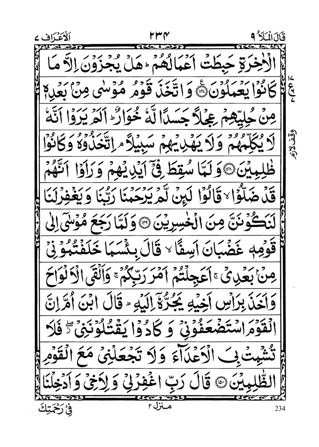 - Wa lammaa raja’a Moosaaa ilaa qawmihee ghadbaana asifan qaala bi’samaa khalaftumoonee min ba’dee ‘a-‘ajiltum amra Rabbikum wa alqal alwaaha wa akhaza bira’si akheehi yajurruhoo ilaiyh; qaalab na umma innal qawmas tad’afoonee wa kadoo yaqtu loonanee; falaa tushmit biyal a’daaa’a wa laa taj’alnee ma’al qawmiz zaalimeen