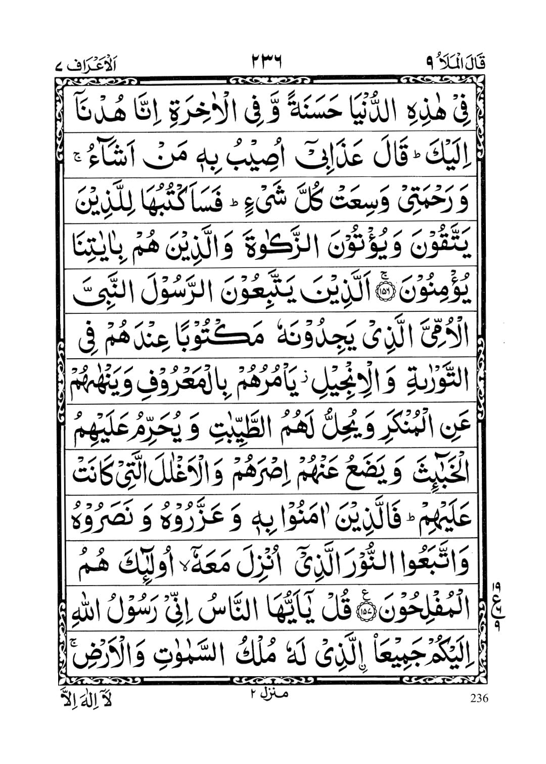 - Allazeena yattabi’oonar Rasoolan Nabiyyal ummiyyal lazee yajidoonahoo maktooban ‘indahum fit Tawraati wal Injeeli ya’ muruhum bilma’roofi wa yanhaahum ‘anil munkari wa yuhillu lahumul taiyibaati wa yuharrimu ‘alaihimul khabaaa’isa wa yada’u ‘anhum israhum wal aghlaalal latee kaanat ‘alaihim; fallazeena aamanoo bihee wa ‘azzaroohu wa nasaroohu wattaba’un nooral lazeee unzila ma’ahooo ulaaa’ika humul muflihoon (section 19)
