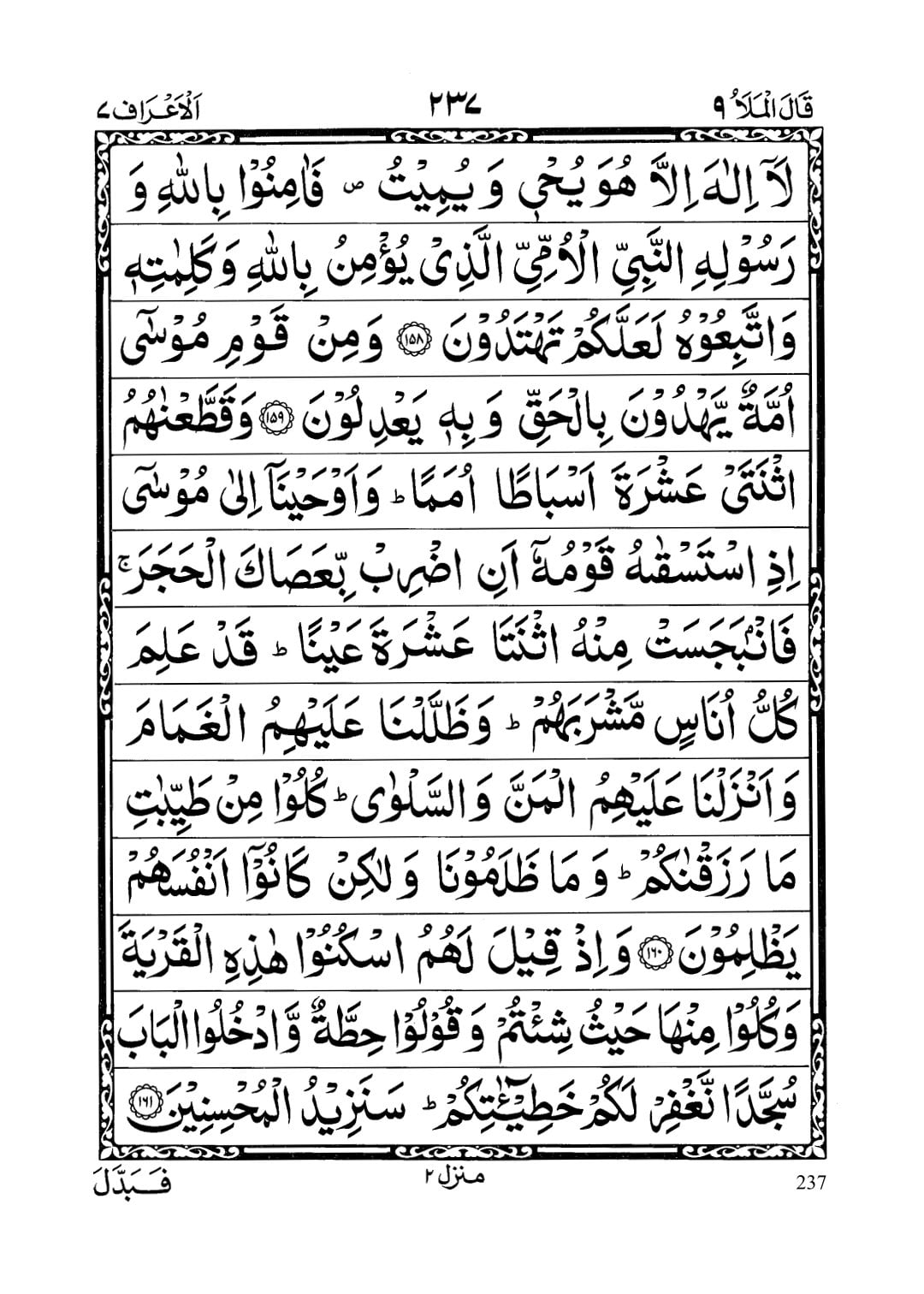- Wa qatta’ naahumus natai ‘ashrata asbaatan umamaa; wa awhainaa ilaa Moosaaa izis tasqaahu qawmuhooo anid rib bi’asaakal hajara fambajasat minhus nata ‘ashrata ‘ainan qad ‘alima kullu unaasim mashrabahum; wa zallalnaa ‘alaihimul ghamaama wa anzalnaa ‘alaihimul manna was Salwaa kuloo min taiyibaati maa razaqnaakum; wa maa zalamoonaa wa laakin kaanooo anfusahum yazlimoon