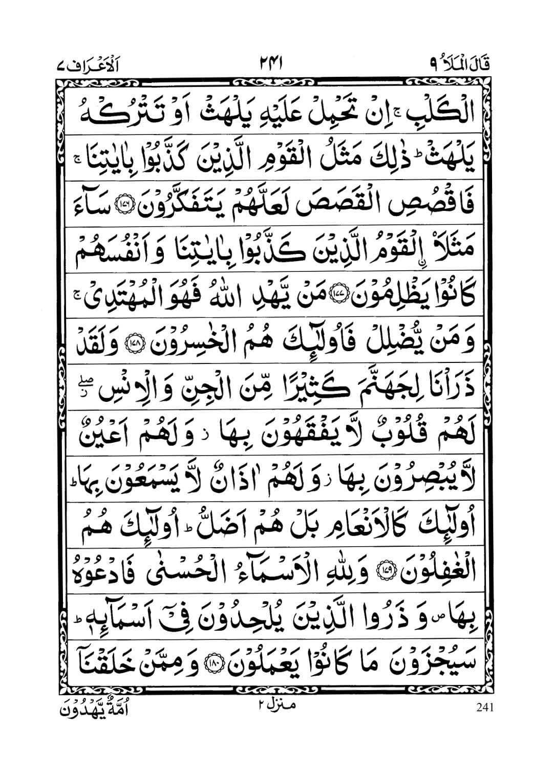 - Wa law shi’naa larafa’naahu bihaa wa laakin nahooo akhlada ilal ardi wattaba’a hawaah; famasaluhoo kamasalil kalbi in tahmil ‘alaihi yalhas aw tatruk hu yalhas; zaalika masalul qawmil lazeena kazzaboo bi Aayaatinaa; faqsusil qasasa la’allahum yatafakkaroon