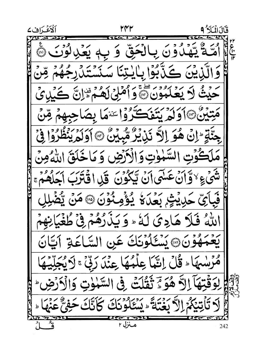 - Yas’aloonaka ‘anis Saa’ati aiyaana mursaahaa qul innamaa ‘ilmuhaa ‘inda Rabbee laa yujalleehaa liwaqtihaaa illaa Hoo; saqulat fis samaawaati wal ard; laa ta’teekum illaa baghtah; yas’aloonaka ka annaka hafiyyun ‘anhaa qul innamaa ‘ilmuhaa ‘indal laahi wa laakinna aksaran naasi laa ya’lamoon