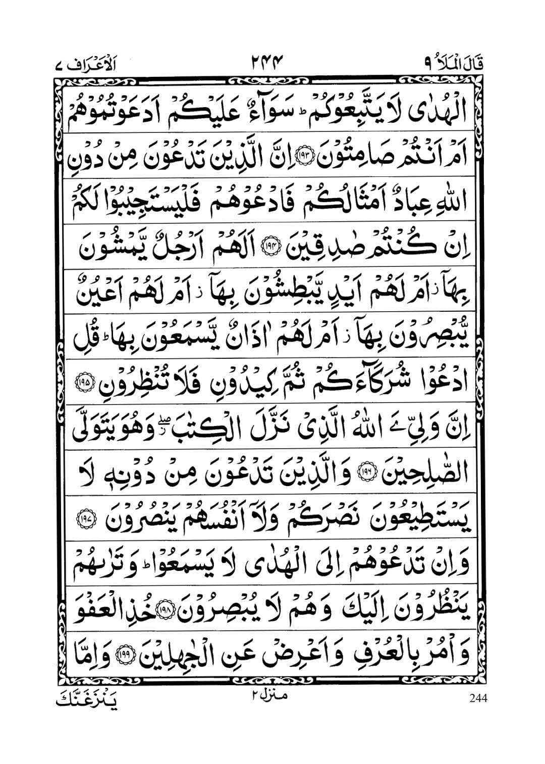 - ‘A lahum arjuluny yamshoona bihaa ‘am lahum ‘aidiny yabtishoona bihaaa ‘am lahum a’yunuy yubsiroona bihaaa ‘am lahum aazaanuny yasma’oona bihaa; qulid’oo shurakaaa’akum thumma keedooni falaa tunziroon
