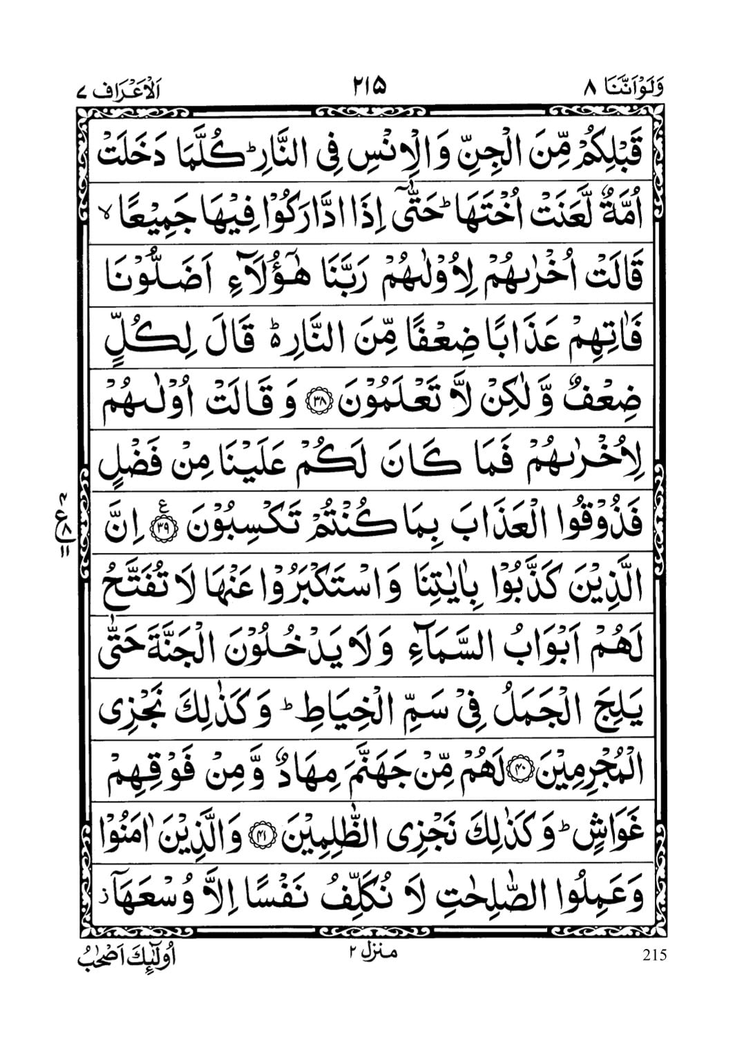 - Qaalad khuloo feee umamin qad khalat min qablikum minal jinni wal insi fin naari kullamaa dakhalat ummatul la’anat ukhtahaa hattaaa izad daarakoo feehaa jamee’an qaalat ukhraahum li oolaahum Rabbannaa haaa u’laaa’i adalloonaa fa aatihim ‘azaaban di’fam minan naari qaala likullin di’funw wa laakil laa ta’lamoon