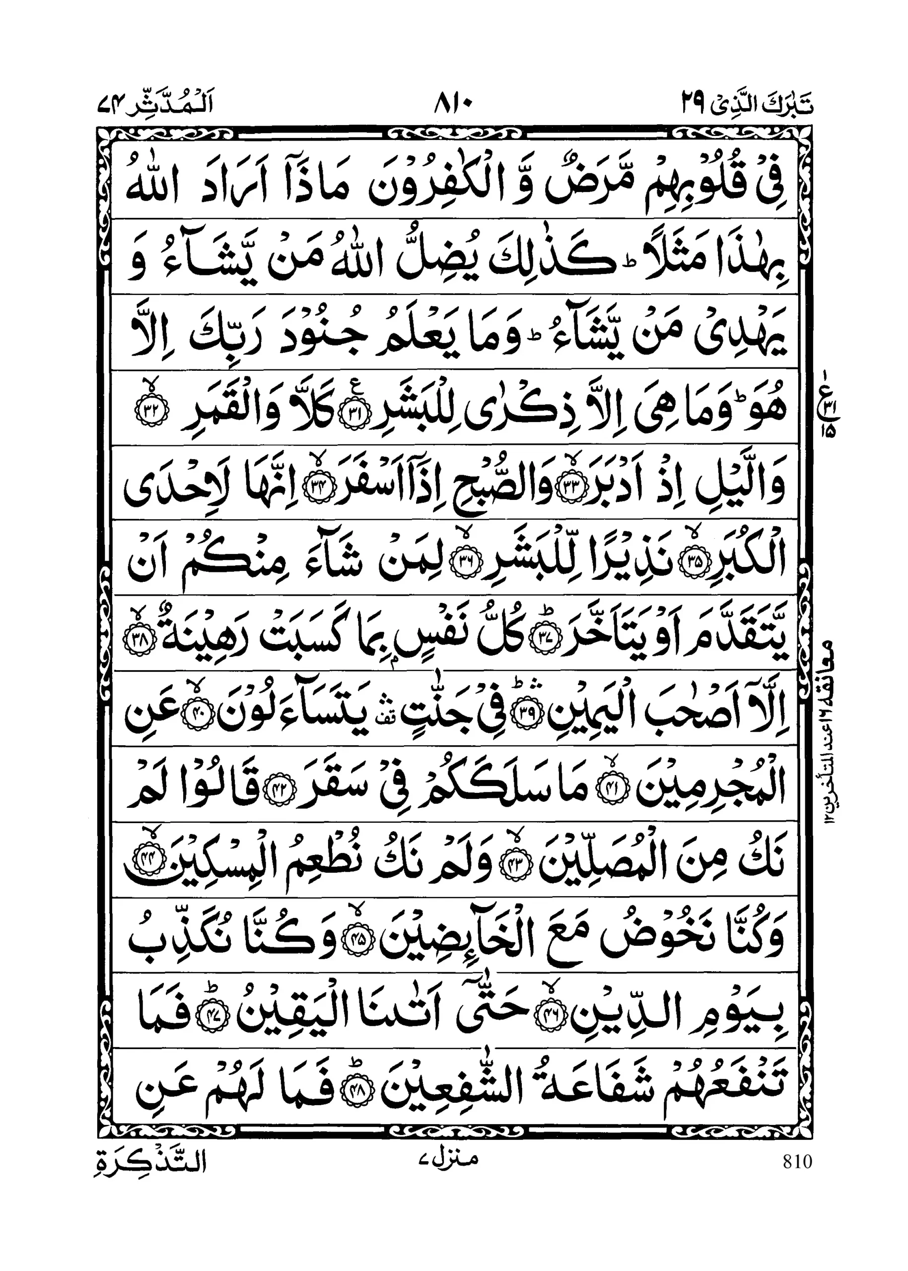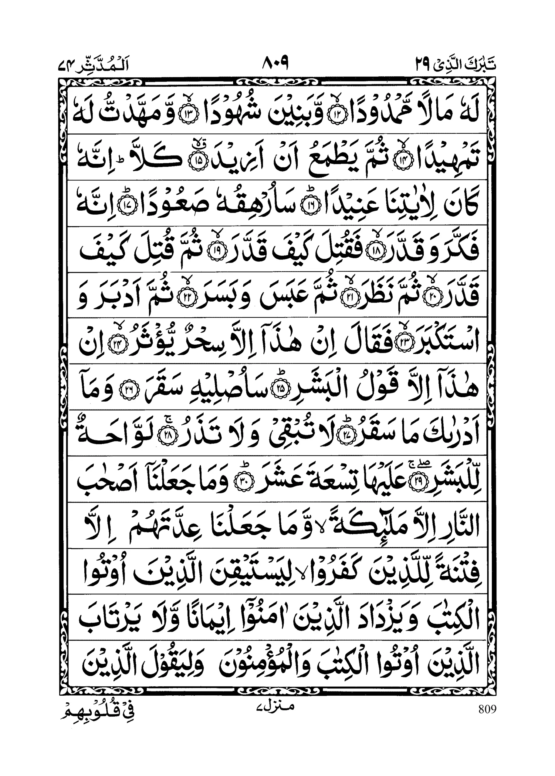 - Wa maaja’alnaaa As-haaban naari illaa malaaa ‘ikatanw wa maa ja’alnaa ‘iddatahum illaa fitnatal lillazeena kafaroo liyastaiqinal lazeena ootul kitaaba wa yazdaadal lazeena aamanooo eemaananw wa laa yartaabal lazeena ootul kitaaba walmu’minoona wa liyaqoolal lazeena fee quloo bihim maradunw walkaafiroona maazaaa araadal laahu bihaazaa masalaa; kazaalika yudillul laahu mai yashaaa’u wa yahdee mai yashaaa’; wa maa ya’lamu junooda rabbika illaa hoo; wa maa hiya illaa zikraa lil bashar