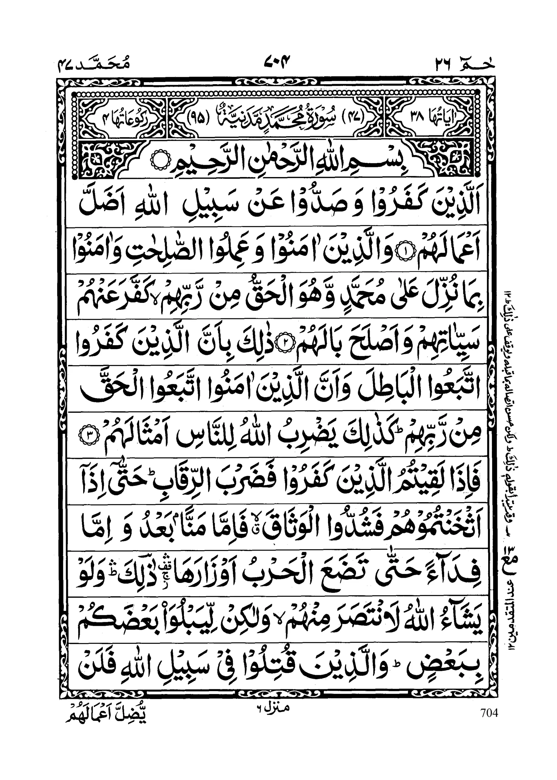 - Fa-izaa laqeetumul lazeena kafaroo fadarbar riqaabi, hattaaa izaa askhan tumoohum fashuddul wasaaqa, fa immaa mannnam ba’du wa immaa fidaaa’an hattaa tada’al harbu awzaarahaa; zaalika wa law yashaaa’ul laahu lantasara minhum wa laakin li yabluwa ba’dakum bi ba’d; wallazeena qutiloo fee sabeelil laahi falany yudilla a’maalahum