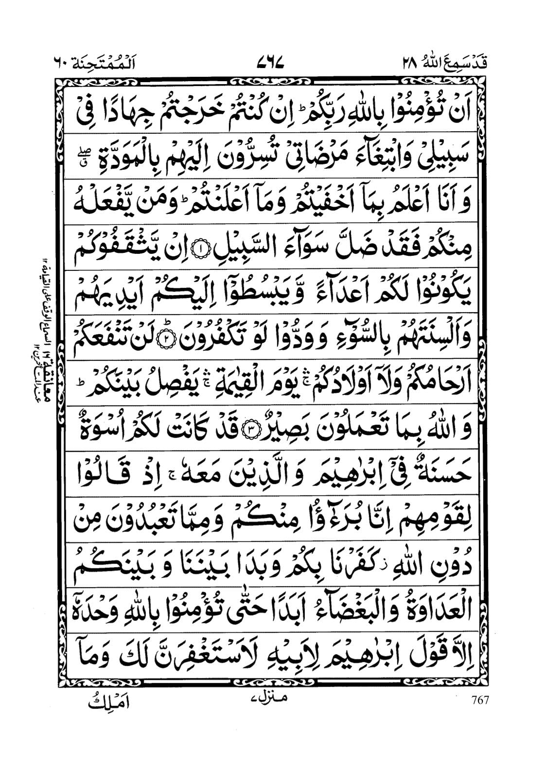 - Yaa ayyuhal lazeena aamanoo laa tattakhizoo ‘aduwwee wa ‘aduwaakum awliyaaa’a tulqoona ilaihim bilmawaddati wa qad kafaroo bima jaaa’akum minal haqq, yukhrijoonar Rasoola wa iyyaakum an tu’minoo billaahi rabbikum in kuntum kharajtum jihaadan fee sabeelee wabtighaaa’a mardaatee; tusirroona ilaihim bilma waddati wa ana a’alamu bimaaa akhfaitum wa maaa a’lantum; wa many yaf’alhu minkum faqad dalla sawaaa’as sabeel