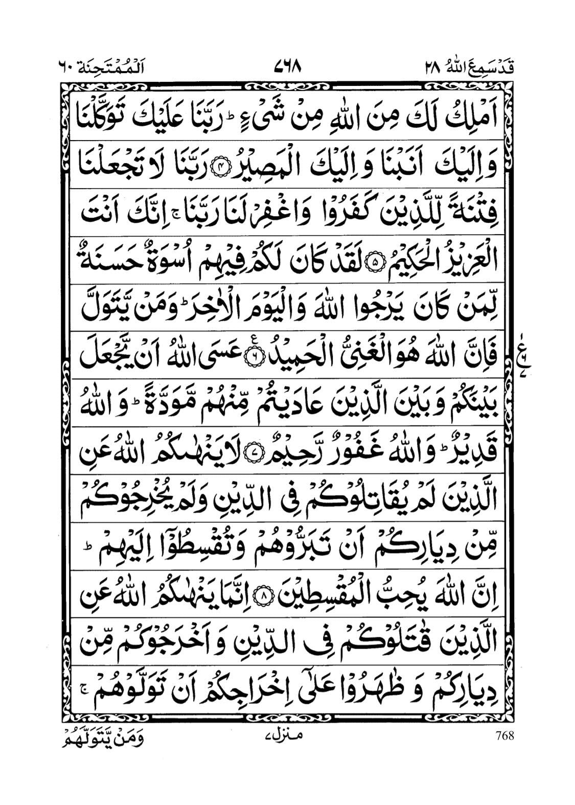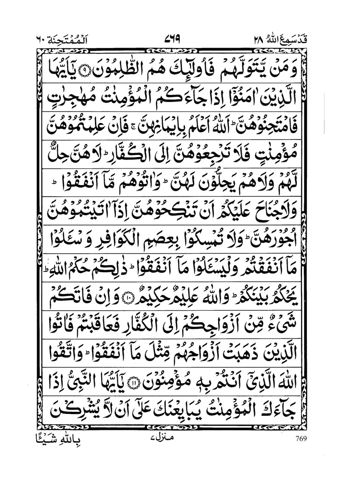 - Yaaa ayyuhal lazeena aamanoo izaa jaaa’akumul mu’minaatu muhaajiraatin famtahinoo hunn; Allaahu a’lamu bi eemaani hinn; fa in ‘alimtumoo hunna mu’minaatin falaa tarji’oo hunna ilal kuffaar; laa hunna hillul lahum wa laa hum yahilloona lahunna wa aatoohum maa anfaqoo wa laa junaaha ‘alaikum an tankihoohunna izaaa aataitumoohunna ujoorahunn; wa laa tumsikoo bi ‘isamil kawaafir; was’aloo maaa anfaqtum walyas’aloo maaa anfaqoo; zaalikum hukmul laahi yahkumu bainakum; wallaahu ‘aleemun hakeem