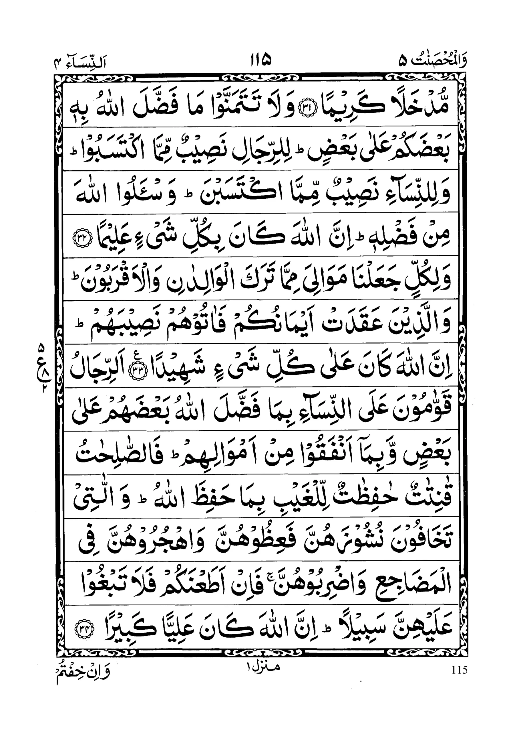 - Wa laa tatamannaw maa faddalal laahu bihee ba’dakum ‘alaa ba’d; lirrijaali naseebum mimmak tasaboo wa linnisaaa’i naseebum mimmak tasabn; was’alullaaha min fadlih; innal laaha kaana bikulli shai’in ‘Aleemaa