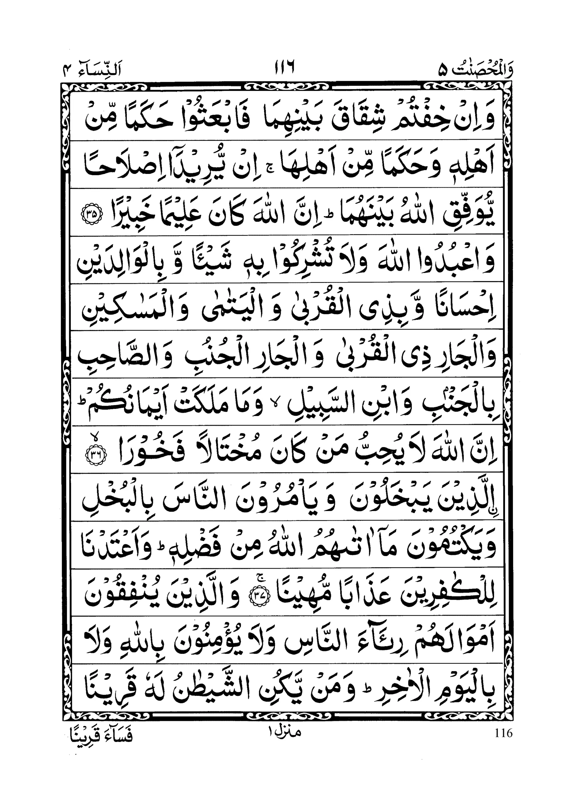 - Wa’budul laaha wa laa tushrikoo bihee shai’anw wa bilwaalidaini ihsaananw wa bizil qurbaa walyataamaa walmasaakeeni waljaari zilqurbaa waljaaril junubi wassaahibi biljambi wabnis sabeeli wa maa malakat aimaanukum; innal laaha laa yuhibbu man kaana mukhtaalan fakhooraa