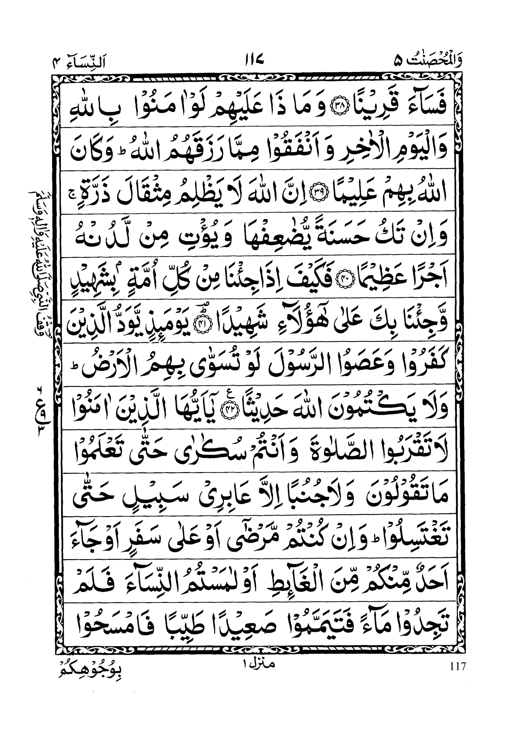 - Yaaa aiyuhal lazeena aamanoo laa taqrabus Salaata wa antum sukaaraa hatta ta’lamoo ma taqooloona wa laa junuban illaa ‘aabiree sabeelin hatta taghtasiloo; wa in kuntum mardaaa aw ‘alaa safarin aw jaaa’a ahadum minkum minal ghaaa’iti aw laamastumun nisaaa’a falam tajidoo maaa’an fatayam mamoo sa’eedan taiyiban famsahoo biwujoohikum wa aideekum; innal laaha kaana ‘Afuwwan Ghafooraa