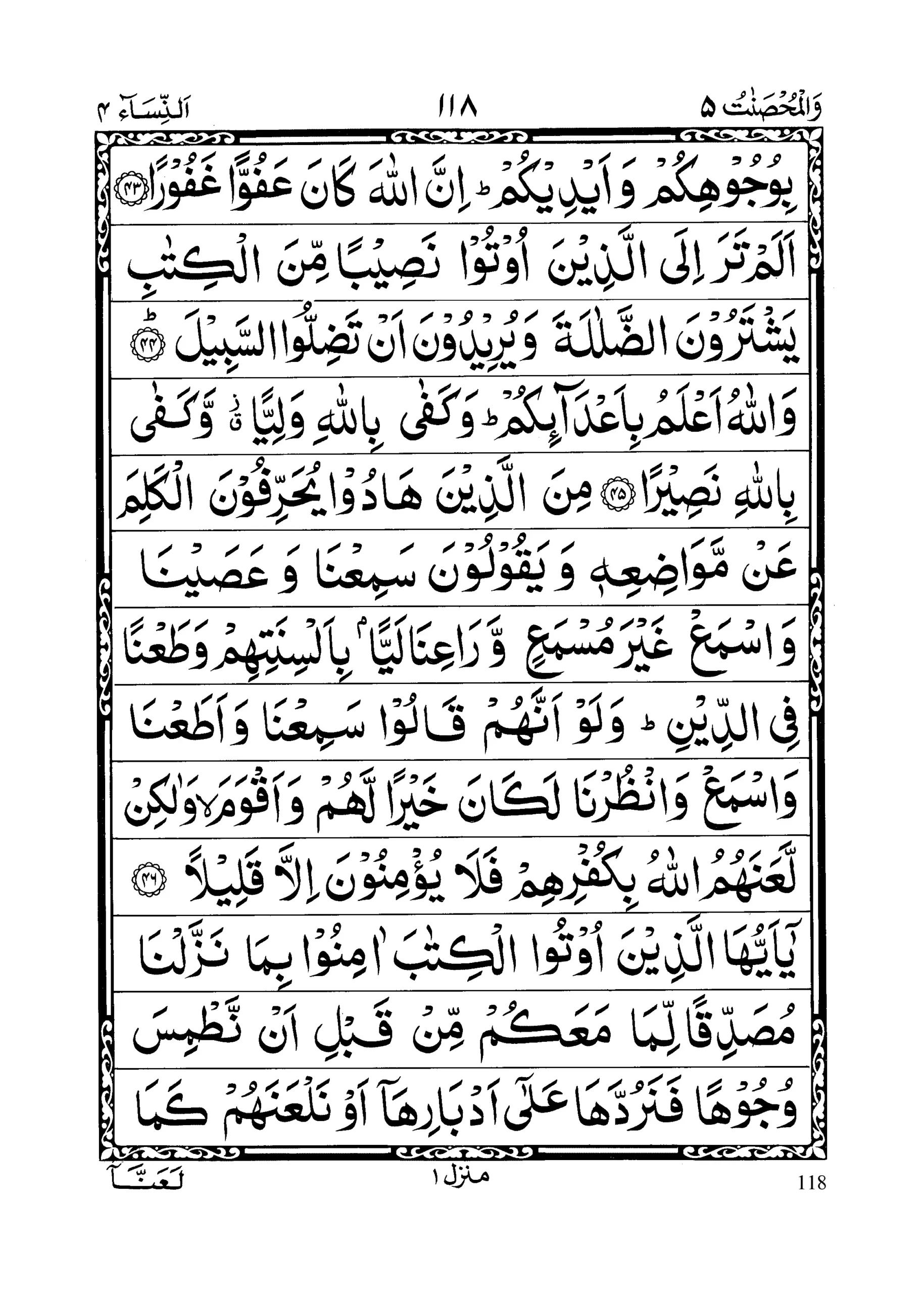 - Hurrimat ‘alaikum umma haatukum wa banaatukum wa akhawaatukum wa ‘ammaatukum wa khaalaatukum wa banaatul akhi wa banaatul ukhti wa ummahaatu kumul laateee arda’ nakum wa akhawaatukum minarradaa’ati wa ummahaatu nisaaa’ikum wa rabaaa’i bukumul laatee fee hujoorikum min nisaaa’ikumul laatee dakhaltum bihinna Fa il lam takoonoo dakhaltum bihinna falaa junaaha ‘alaikum wa halaaa’ilu abnaaa’ikumul lazeena min aslaabikum wa an tajma’oo bainal ukhtaini illaa maa qad salaf; innallaaha kaana Ghafoorar Raheema (End Juz 4)