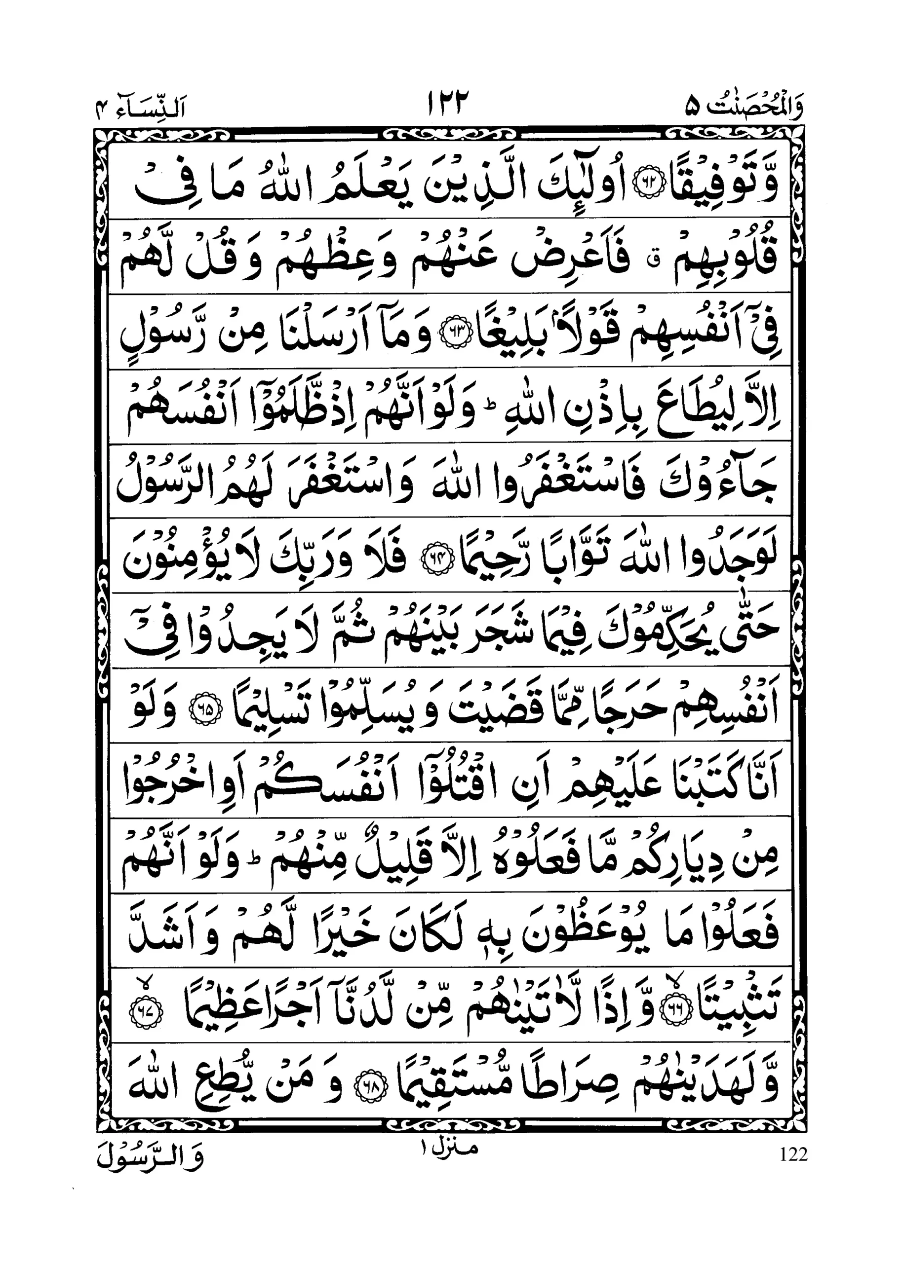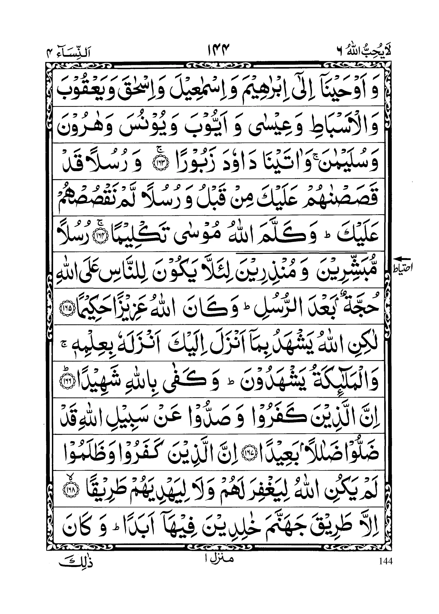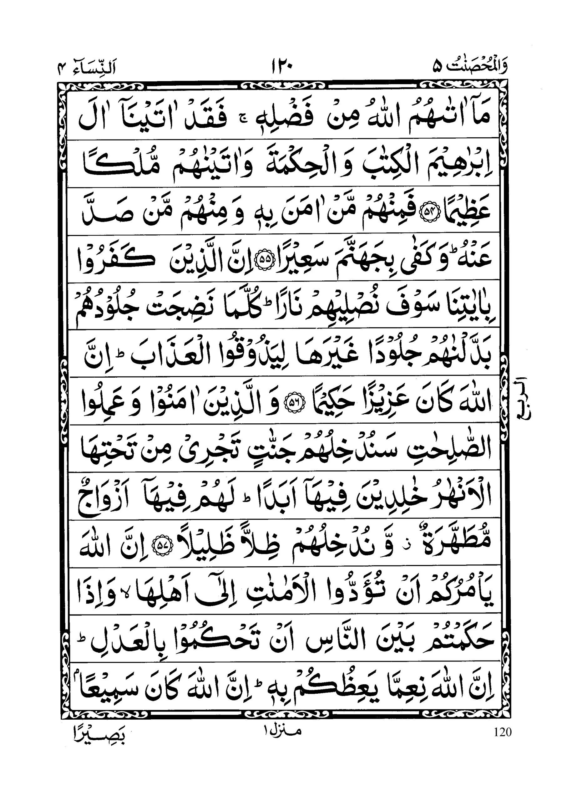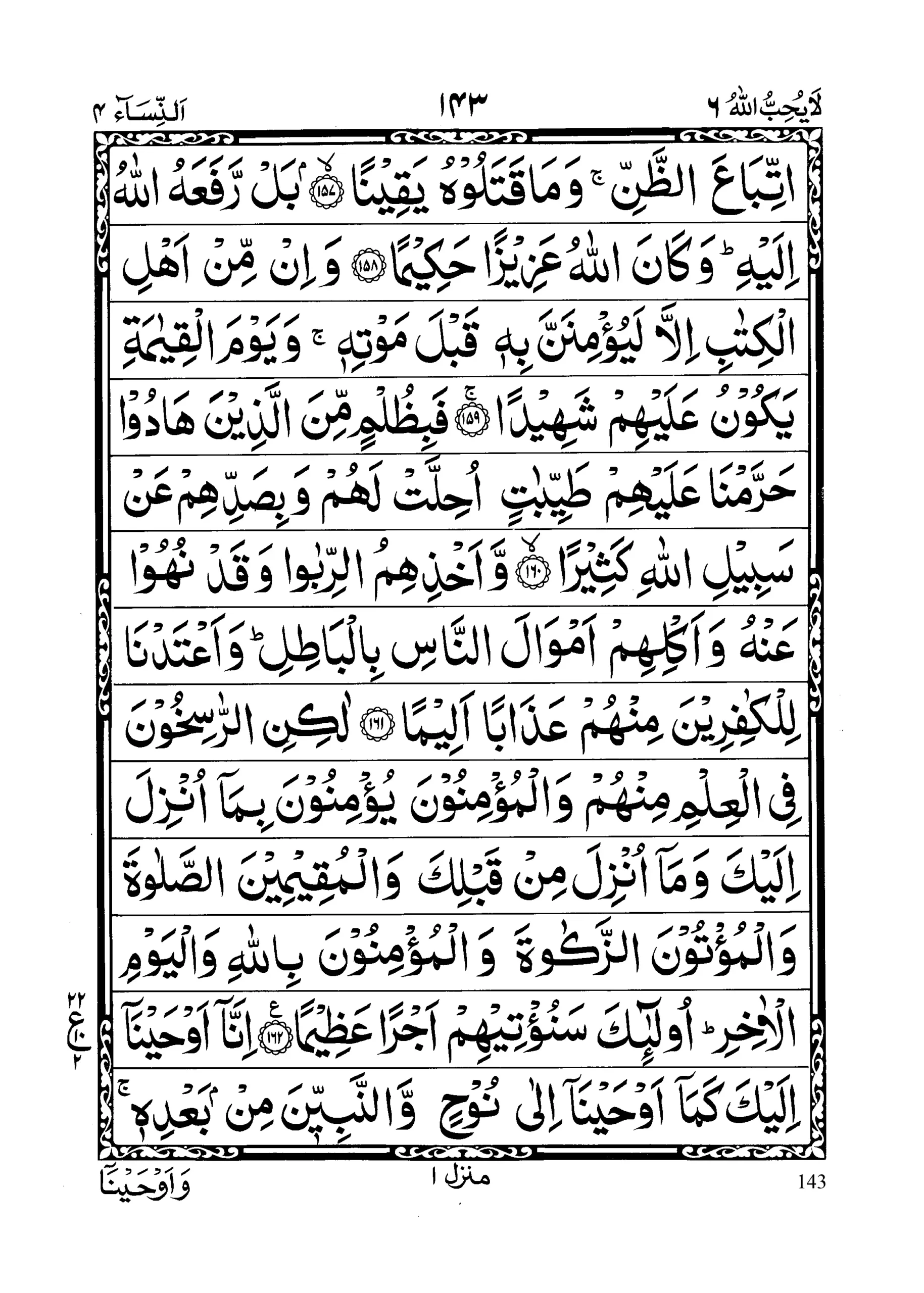 - Laakinir raasikhoona fil’ilmi minhum walmu’minoona yu’minoona bimaaa unzila ilaika wa maaa unzila min qablika walmuqeemeenas Salaata walmu’toonaz Zakaata walmu ‘minoona billaahi wal yawmil Aakhir; ulaaa’ika sanu’teehim ajran ‘azeemaa (section 22)