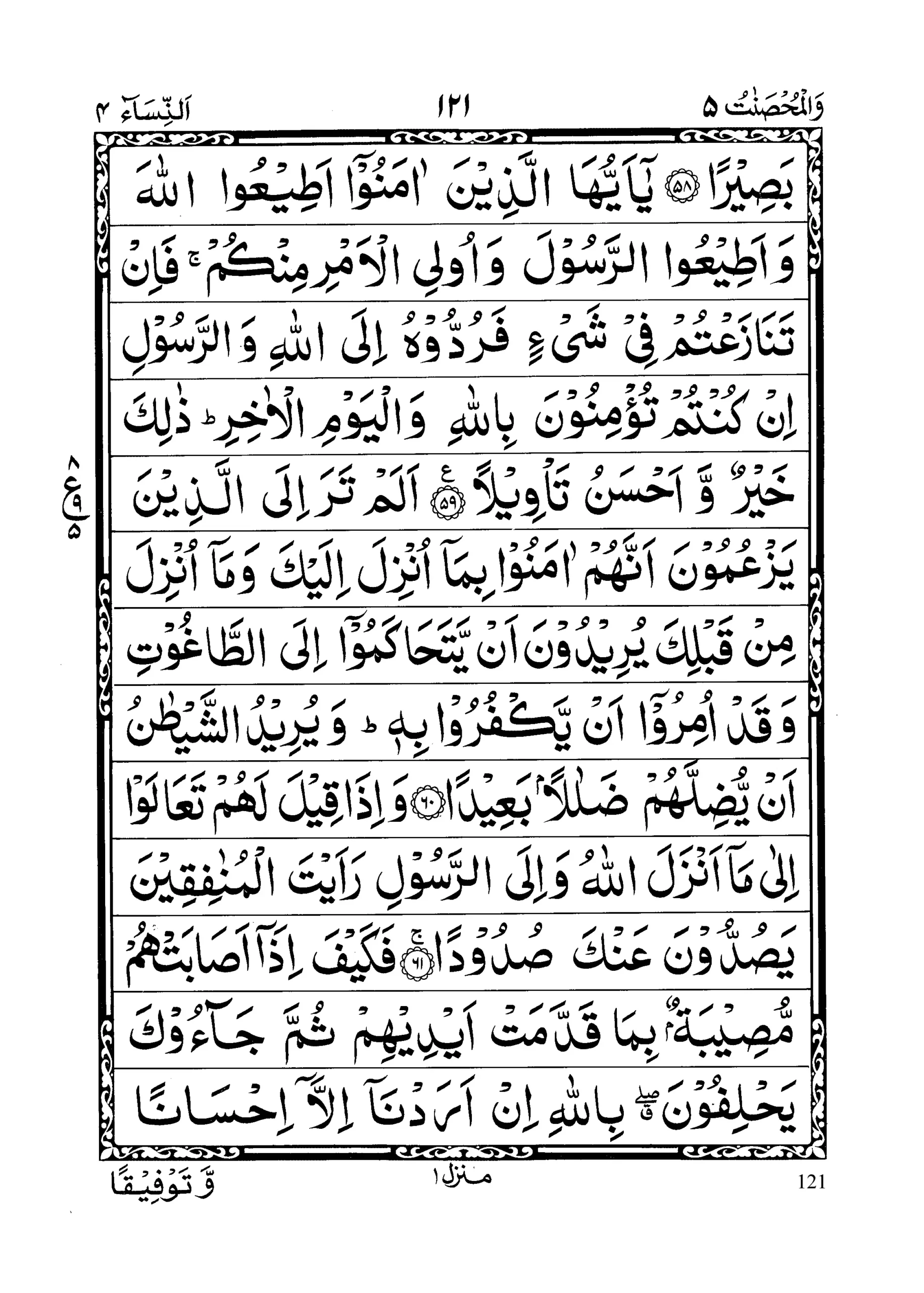 - Yaaa aiyuhal lazeena aamanooo atee’ul laaha wa atee’ur Rasoola wa ulil amri minkum fa in tanaaza’tum fee shai’in faruddoohu ilal laahi war Rasooli in kuntum tu’minoona billaahi wal yawmil Aakhir; zaalika khairunw wa ahsanu ta’weelaa (section 8)